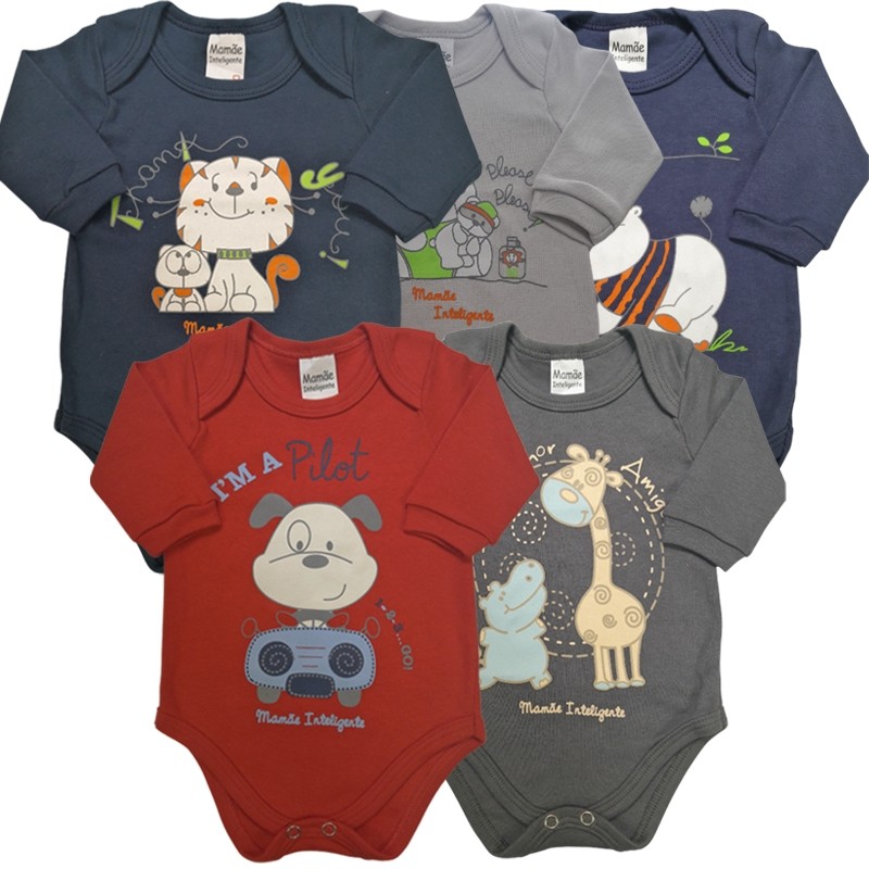 Kit com 5 Bodys Bebê Manga Longa Estampado Mamãe Inteligente