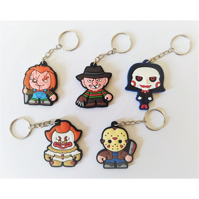 kit com 5 Chaveiros Emborrachados Coleção Halloween Freddy Krueger/It A Coisa/Jason Voorhees/Jigsaw/Chucky