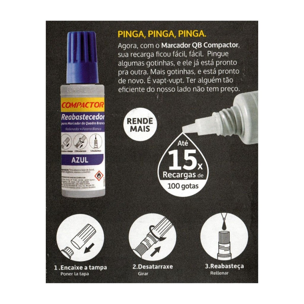 KIT 5 REFIL REABASTECEDOR + 5 PINCEL MARCADOR DE QUADRO BRANCO COMPACTOR Pedidos feitoas ate as 12:00 h (Seg a Sex) serão enviados no mesmo dias!!!!! DESCRIÇÃO: ● Contém: 30ml ● Recarrega até 15 vezes ● Tinta atóxica ● Composição: a base de álcool, corantes orgânicos, resinas e solventes Reabastecedor QB 30ml Mantenha seu marcador funcionando por muito mais tempo. Use recargas originais Compactor. A tinta reabastecedora Compactor é a garantia que você tem para usar seu marcador por muito mais tempo sem comprometer a qualidade do produto.