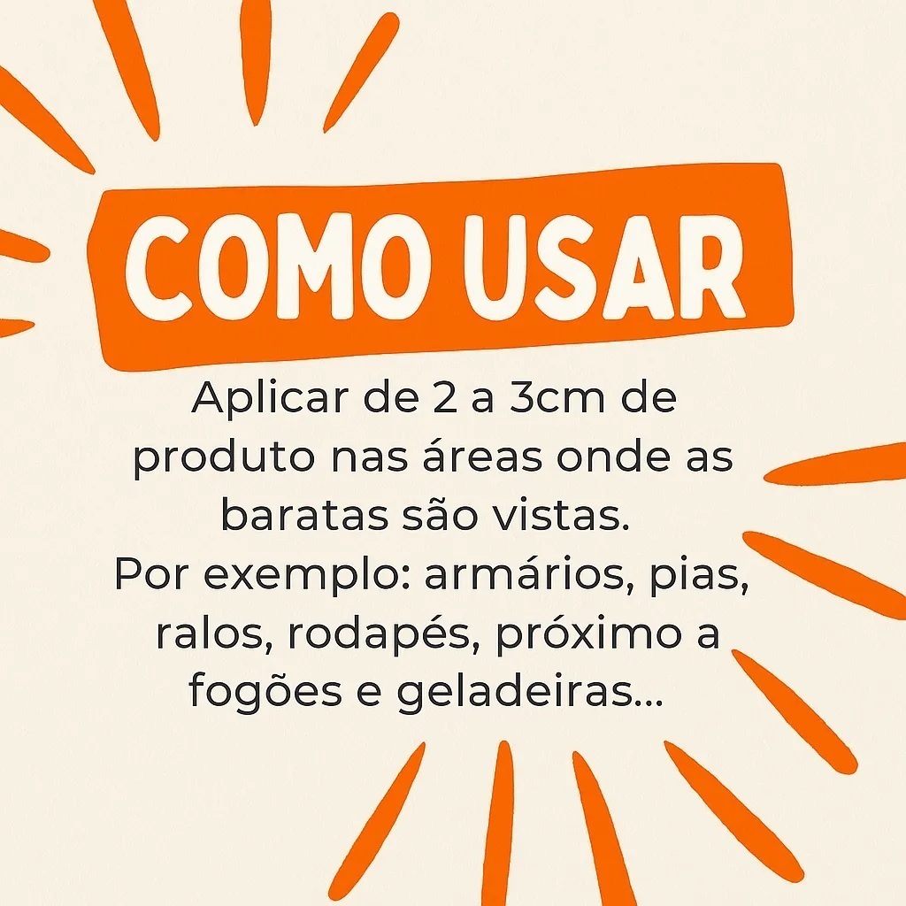 Elimine baratas de forma rápida, eficaz e duradoura! O BarataGel é a solução ideal para quem busca um método eficiente, prático e discreto no combate às baratas. Com fórmula especializada, o gel atrai e elimina as baratas diretamente na colônia, agindo de forma prolongada e precisa. Graças à sua apresentação em seringa, o produto permite aplicação em pontos estratégicos, como frestas, cantos, rachaduras e outros locais de difícil acesso, onde os insetos costumam se esconder. Destaques do Produto: ✅ Alta Eficácia: Formulação potente que elimina baratas de forma rápida e atinge o ninho. ✅ Fácil Aplicação: Seringa prática, ideal para uso direcionado e preciso. ✅ Discreto e Seguro: Produto inodoro, de uso interno, com baixa toxicidade quando utilizado corretamente. ✅ Proteção Duradoura: Ação prolongada que mantém o ambiente livre de baratas por semanas. Especificações: Tipo: Gel inseticida contra baratas Conteúdo:5 seringas de 10g cada (total de 50g) Aplicação: Indicado para uso em ambientes internos, como cozinhas, banheiros, armários, despensas, e áreas comerciais Modo de Uso: Aplique pequenas gotas (0,1g) nos locais de passagem ou esconderijo das baratas Ideal para fendas, rodapés, atrás de eletrodomésticos e móveis Segurança: Manter fora do alcance de crianças e animais domésticos Armazenamento: Conservar em local fresco e seco Com o BarataGel, você protege sua casa ou negócio com praticidade e resultados comprovados. Garanta já o seu kit e fique livre das baratas de uma vez por todas!