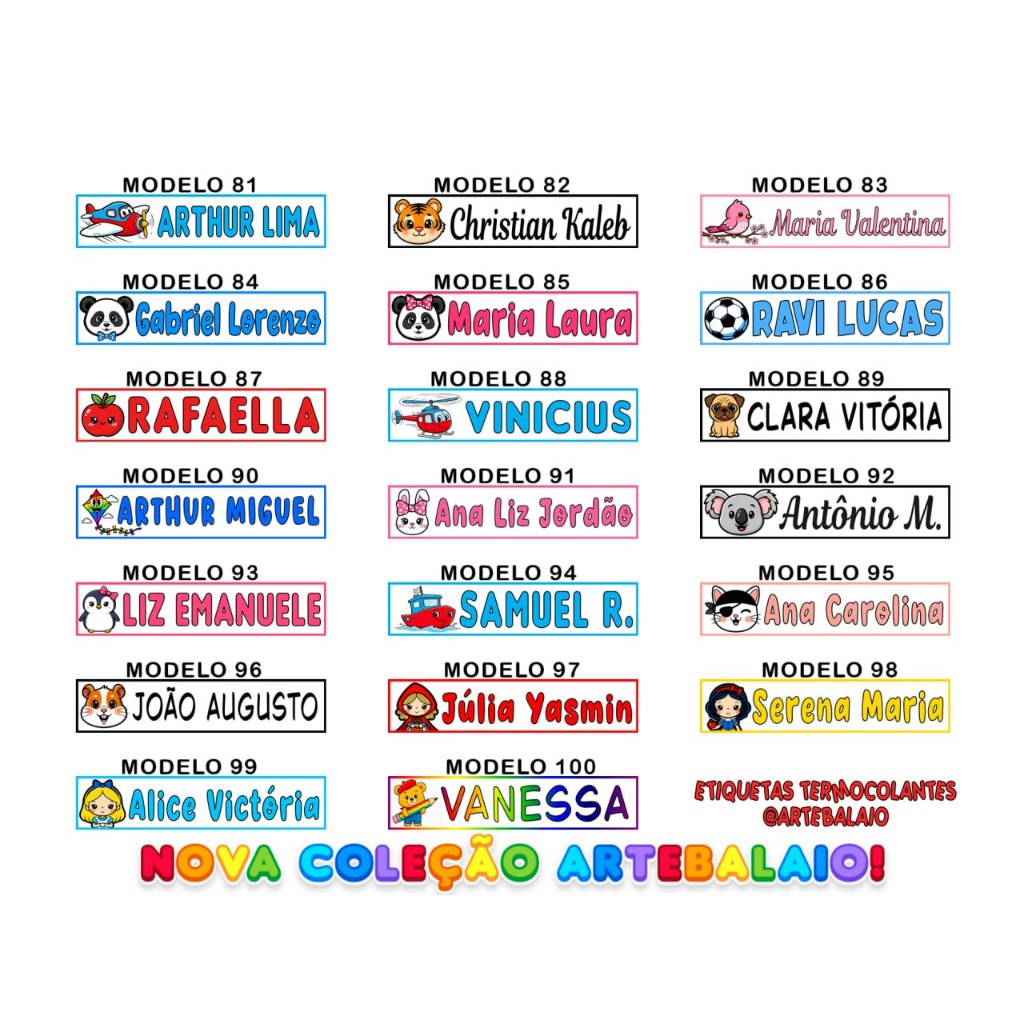 dentifique roupas e uniformes escolares de forma prática, bonita e duradoura! Escolha seu kit com 50,100,150,200 etiquetas termocolantes personalizadas (5x1cm) é perfeito para roupas de creche, escola, maternal e atividades esportivas. ✅ Vantagens das nossas etiquetas: Personalização com nome e personagem à sua escolha Resistentes à lavagem e secagem Fixação firme, não solta e não desbota Toque macio, não irrita a pele da criança Evitam perda de roupas e confusão de uniformes Fácil aplicação em casa, sem necessidade de costura 🛠️ Como aplicar (passo a passo): Recorte a etiqueta da cartela. Retire toda a água do ferro. Pré-aqueça o ferro seco (temperatura algodão – sem vapor). Posicione a etiqueta no local desejado (desenho para cima). Cubra com pano fino ou papel manteiga. Pressione o ferro parado sobre a etiqueta por 15 segundos. Caso necessário, repita aplicando pressão extra nos cantos. Aguarde esfriar e espere 24h antes da primeira lavagem. 📦 Informações do Produto: Contém: 1 cartela kit com 50,100,150,200 etiquetas (5x1cm) As etiquetas não vêm recortadas (recorte simples com tesoura) Personalização com nome e até 2 nomes (nome + sobrenome) Material: 100% Poliéster Impressão em tinta gel de alta fixação Desenhos delicados que embelezam e identificam a roupa ⚡ Observações Importantes: Após a compra, nos envie o nome e personagem desejado pelo chat. Para outros tamanhos e personagens, consulte-nos no chat antes da compra. ✨ Mais de 1.400 clientes já escolheram nossas etiquetas para identificar roupas com praticidade e segurança. Garanta já as suas!