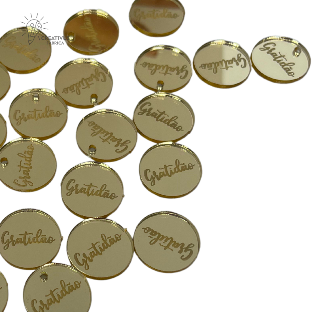 KIT COM 50 tags Escrito GRATIDÃO aplique REDONDO 2cm Acrílico Espelhado