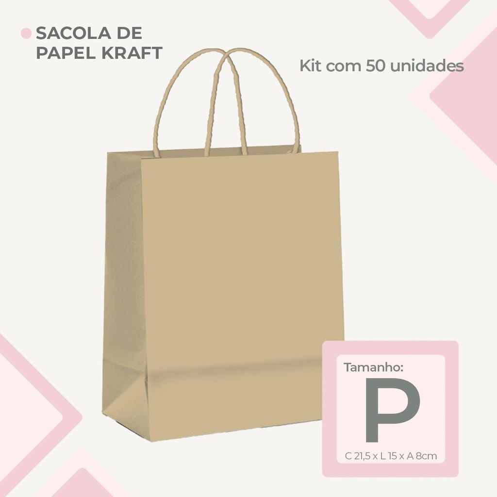 Kit com 50Un de Sacolas de Papel Kraft P Econômica Biodegradável e Reciclável 21,5x15x8cm