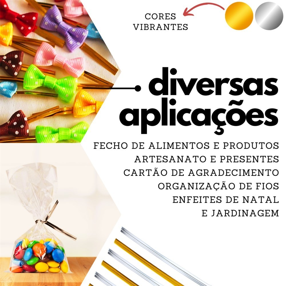 AMARRILHO - ARAME PLASTIFICADO Este amarrilho de 10 cm vem com 520 unidades e está disponível nas cores prata e dourado. É perfeito para fechar embalagens de alimentos e produtos, fixando o cartão de agradecimento. Além disso, pode ser usado para artesanato e para criar enfeites de Natal e presentes. Adquira agora o amarrilho 10cm 520un e facilite sua vida na hora de embalar seus produtos ou presentes. Confira algumas sugestões de uso abaixo. - Informações do produto - Quantidade: 520 amarrilhos - Cores: Dourado ou prata - Tamanho: 10 cm - Sugestões de uso - Fechar embalagem de alimentos - Fechar embalagens de produto, fixando o cartão de agradecimento - Artesanato - Máscaras, auxiliando no molde do nariz - Enfeites de natal e presentes Vendido por Arello Utilidades