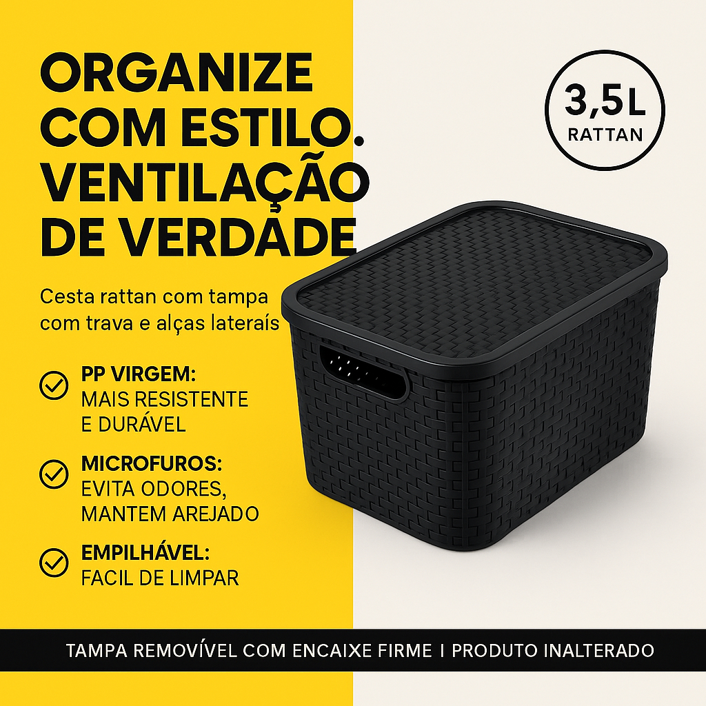 Cesto Organizador Rattan com tampa, tamanho P - 3,5 litros (caixa pequena) **Comprimento -20,5 cmLargura- 15,5 cmAltura -14 cmFabricante: Monte Libano