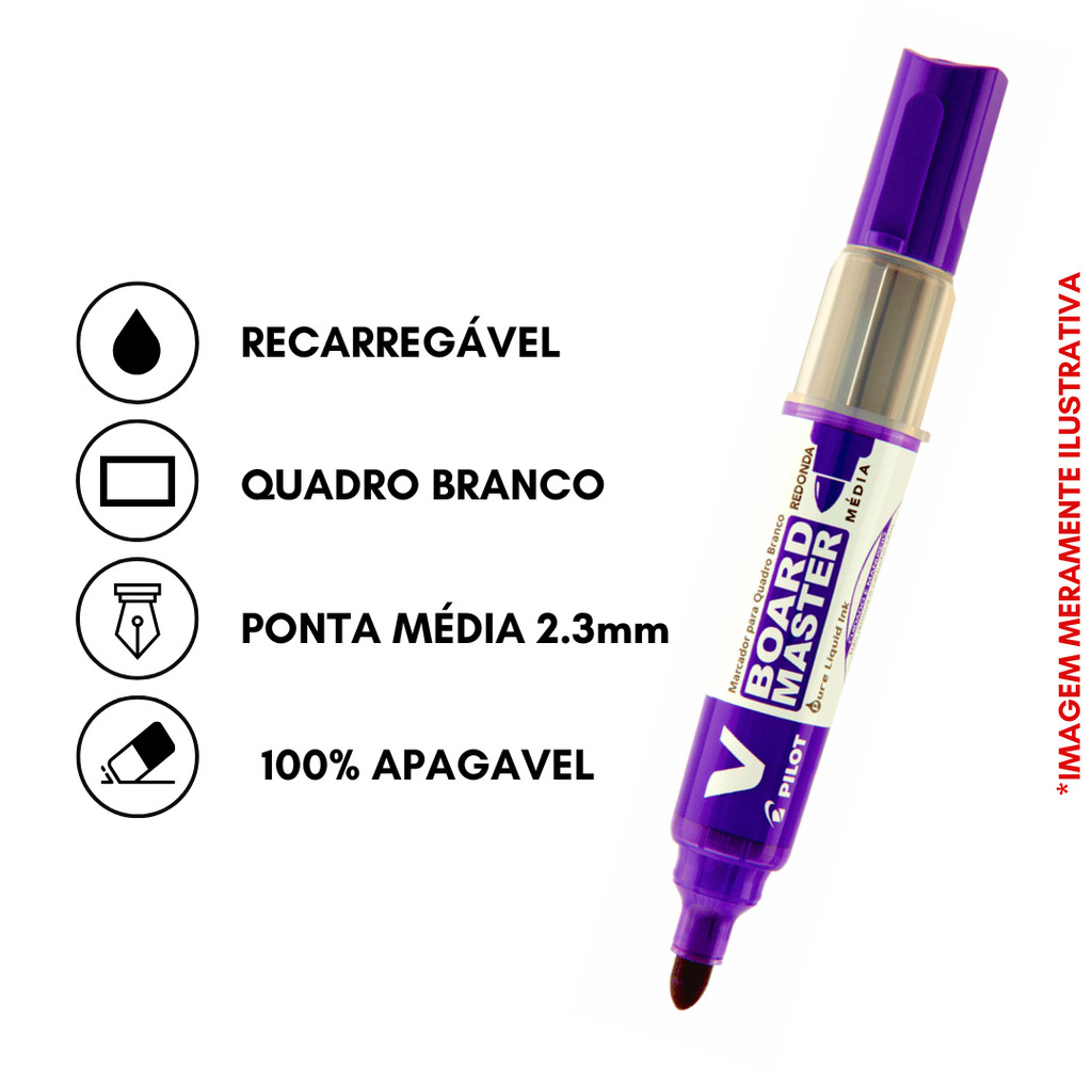 Pedidos feitos até 12:00 (MEIO DIA) serão enviados no MESMO DIA!!!Kit com 6 Cores de Marcadores Para Quadro branco PILOTO / PILOT1 UN DE CADA COR:AzulPretoVermelhoVerdeVioletaLaranja Diversas cores O marcador V Board Master foi especialmente desenvolvido com componentes de última tecnologia japonesa para o uso em quadro branco. Possui ponta macia que não danifica o quadro e tinta apaga facilmente.O seu constante fluxo de tinta líquida conta com o sistema que permite a escrita imediata, sem a necessidade de agitar ou bombear, proporcionando uma excelente qualidade de uso do começo ao fim.Ah, e o melhor!O V Board Master faz parte da linha Be Green da PILOT, fabricado a partir de plástico reciclado, dessa forma, 91% do material utilizado em sua fabricação, é reciclado. O grande beneficiado é o planeta, já que não é mais necessário comprar um novo marcador após o término da tinta, basta substituir o refil (cartucho) e periodicamente a ponta (conforme o desgaste), além disso, você também sai ganhando ao economizar em longo prazo.Ponta de poliéster 6.0mm.Espessura de escrita 2.3mm.REFIL E PONTA SUBSTITUÍVEIS.