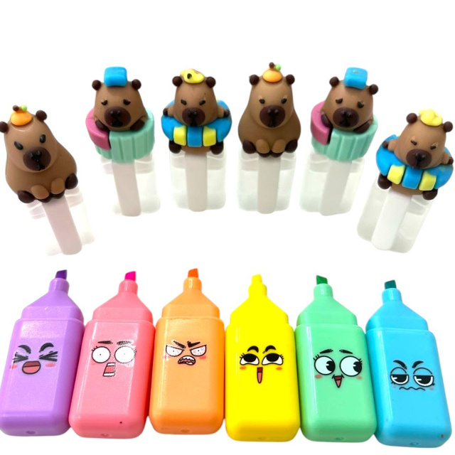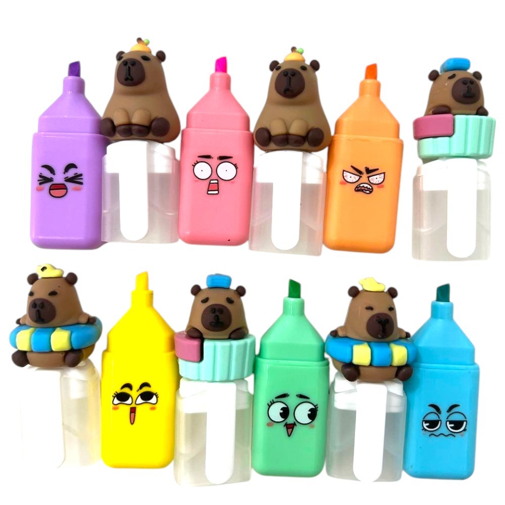 Kit com 6 Cores Marca Texto Capivara Estampa com Carinhas - Papelaria Fofa