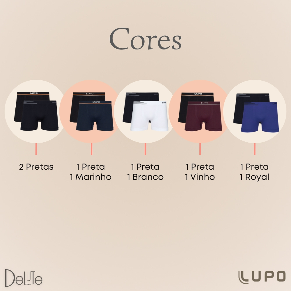 Kit De Cuecas Boxer Basic Microfibra Lupo Sem Costura Ref. 436 - Original Cueca boxer masculina Lupo. O kit é composto por 2 cuecas masculinas para adultos, modelo boxer confeccionado em microfibra da marca Lupo. Cueca boxer para homens que gostam de estilo. Com formato anatômico, muito mais conforto, malha com elasticidade para ajuste perfeito. Para garantir leveza e suavidade a cada movimento, invista no bem-estar que a cueca sem costura proporciona no dia a dia, escolha certa para acompanhar homens modernos e sofisticados. - Antimicrobial - Tratamento de Higienização. - Seamless Dry - Sem Costura. - Malha Elasticidade Para Ajuste Perfeito. - Acabamento com Elasticidade Multidirecional. - Ótimo Custo Benefício Na Compra Do Kit. - Qualidade Lupo. Composição: Poliamida 96% - Elastano 4% Tamanhos: P (38 a 40) - M (42 a 44) - G (46 a 48) - GG (50 a 52) Descrição da Marca Lupo é uma das maiores e melhores fabricantes de moda íntima e meias. Em 1947 a empresa já era o maior fabricante de meias masculinas do Brasil, a partir de 1990 a Lupo ampliou sua linha de produtos, passando a fabricar cuecas, e hoje é uma das marcas mais conhecidas neste ramo. Cueca Boxer Lupo Kit As cuecas boxer ou "cuecas box" tornaram-se muito populares no Brasil. Elas ocupam atualmente o posto das cuecas chamadas slip, que são as famosas sungas. Esses modelos são unanimidade quando se trata de um fator importante: as cuecas boxer deixam a aparência do homem bem melhor do que as cuecas tipo sunga. Com essa e outras vantagens a Cueca Boxer Lupo é uma ótima pedida para o homem que precisa de conforto, durabilidade e, é claro, confiança na hora de vestir uma cueca.