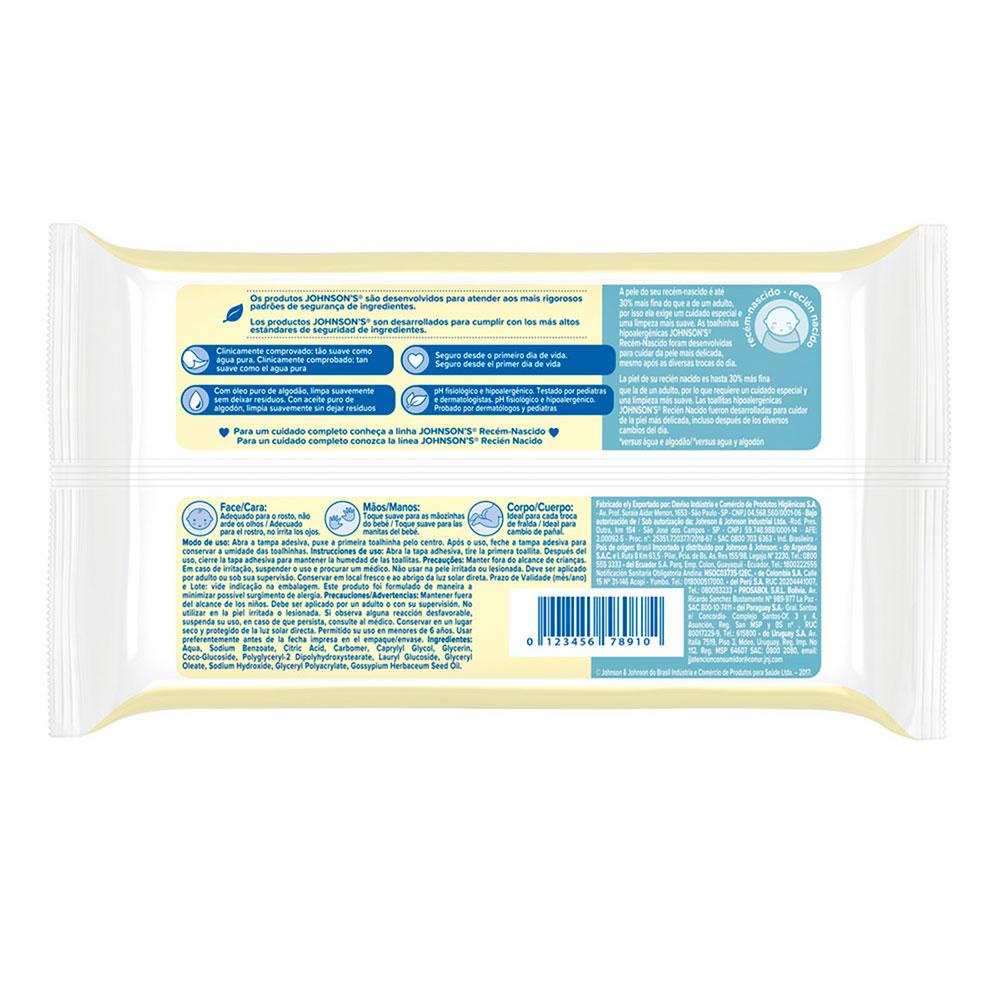 As novas Toalhinhas Umedecidas JOHNSON'S® baby Recém-Nascido foram desenvolvidas sabendo que a pele do recém-nascido precisa de cuidados especiais. Para limpar todas as sujeirinhas de maneira suave e eficiente, nada melhor do que um produto tão suave quanto a água da cabeça aos pés. São produzidas com fibras mais macias e espessas, fazendo com que sejam suaves, mais absorventes e super resistentes. Dermatologicamente testadas, hipoalergênicas e sem álcool.Desenvolvidas com a fórmula Chega de Lágrimas®, podem ser utilizadas em todo o corpinho do bebê, inclusive ao redor dos olhos. 1. Puxe a lingueta da etiqueta adesiva na indicação "Abrir" e retire um a um os lenços umedecidos JOHNSON'S® 2. Passe o lenço umedecido nas áreas que deseja limpar; 3. Jogue os lenços utilizados no lixo; 4. Após o uso, feche a etiqueta adesiva para conservar a umidade dos lenços. Indicação: uso infantil e adulto.