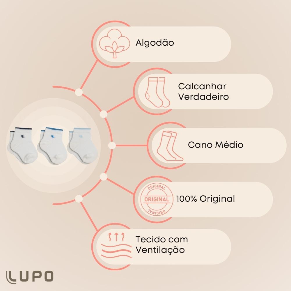Kit 6 Meias Baby Lupo Ref: 2165 Meias Lupo Baby confeccionadas em algodao, poliamida e outras fibras proporcionando conforto, vida util e um toque macio sobre a pele, com punho soft para nao apertar nem incomodar durante o uso, com cores basicas que agradam a todos os gostos, ideal para ser utilizada no dia a dia com o punho colorido trazendo total charme para a peca e compondo os looks dos pequeno, e a qualidade excepcional Lupo. - Punho Soft. - Calcanhar verdadeiro, anatomico. - Malha de alta qualidade. - Ajuste perfeito no pe. - Conforto. - Qualidade Lupo. Tamanhos: RN - 0 a 4 P - 16 a 19 M - 20 a 23 Composicao: Algodao 71%, Poliamida 26% e Outra Fibra 3%