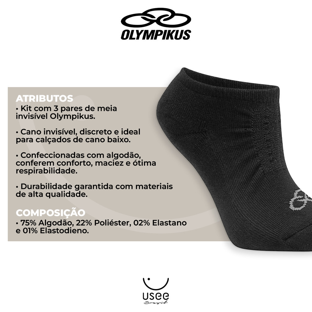 Kit com 6 Pares de Meias Invisível Adulto Algodão Macio Original Olympikus