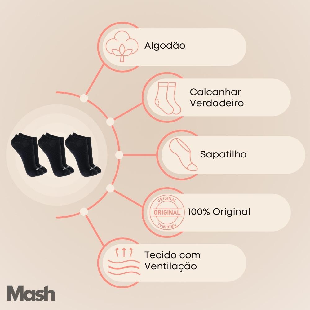 Kit Com 6 Pares De Meias em Algodao Esportiva Sapatilha Soquete Mash Original Ref.0M002 - O trio possui cores basicas e confortaveis. - Podem ser usadas tanto para pratica de exercicios fisicos como no dia a dia; - A meia soquete e ideal para nao aparecer no calcado - Excelente QUALIDADE MASH que todos conhecem. Composicao : 69% algodao, 29% poliamida e 2% elastano TAMANHOS P (28 a 33) M (34 a 38) G (39 a 43) Presente no dia a dia do brasileiro ha quase 50 anos, a Mash e referencia de moda intima nao apenas pela tradicao, mas tambem pela alta qualidade, design diferenciado e inovacao! POR FAVOR TIRE TODAS SUAS DUVIDAS NO CAMPO DE PERGUNTAS, ESTAMOS A SUA DISPOSICAO PARA AJUDAR.