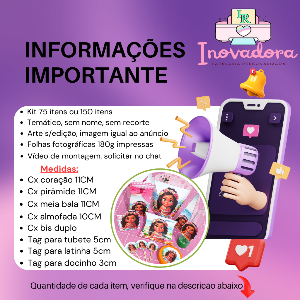LEIA COM ATENÇÃO... LEMBRANCINHAS TEMA: DIVERSOS 🔴 Enviar as informações no ato da compra. Caso não envie, o produto será coletado sem informações 🔴 Apliques e tags não serão personalizados somente as caixas. CONTÉM: 75 ITENS DIVERSOS ⬇️KIT SEM ALTERAÇÃO, CONTENDO: *05 CAIXAS CORAÇÃO (11CM) *05 CAIXAS MINI ALMOFADA (8CM) *05 CAIXAS BIS DUPLO (5CM) *05 CAIXAS MEIA BALA (11CM) *05 CAIXAS PIRÂMIDES (11CM) *10 TAGS PARA LATINHAS (5CM) *10 TAGS PARA TUBETES (5CM) *30 TAGS PARA DOCINHO (3CM) CONTÉM: 150 ITENS DIVERSOS ⬇️KIT SEM ALTERAÇÃO, CONTENDO: *10 CAIXAS CORAÇÃO (11CM) *10 CAIXAS MINI ALMOFADA (8CM) *10 CAIXAS BIS DUPLO (5CM) *10 CAIXAS MEIA BALA (11CM) *10 CAIXAS PIRÂMIDES (11CM) *20 TAGS PARA LATINHAS (5CM) *20 TAGS PARA TUBETES (5CM) *60 TAGS PARA DOCINHO (3CM) OBSERVAÇÕES: SÃO FOLHAS SEM RECORTE (cliente recorta, dobra e cola); ENVIAMOS VÍDEO ILUSTRATIVO DE COMO MONTAR; PRODUZIDO EM PAPEL FOTOGRÁFICO 180G; NÃO ALTERAMOS MODELOS E NEM ARTE; NÃO INCLUSO LAÇO. IMPORTANTE SABER: As cores das fotos podem não representar fidelidade, podendo sofrer pequenas alterações por causa do monitor de cada computador, as cores podem variar de acordo com o brilho e contraste do seu monitor. Por se tratarem de produtos artesanais e únicos, podem ocorrer pequenas variações. As medidas porém sofrem pequenas diferenças em relação ao corte entre 1 e 2 milímetros.
