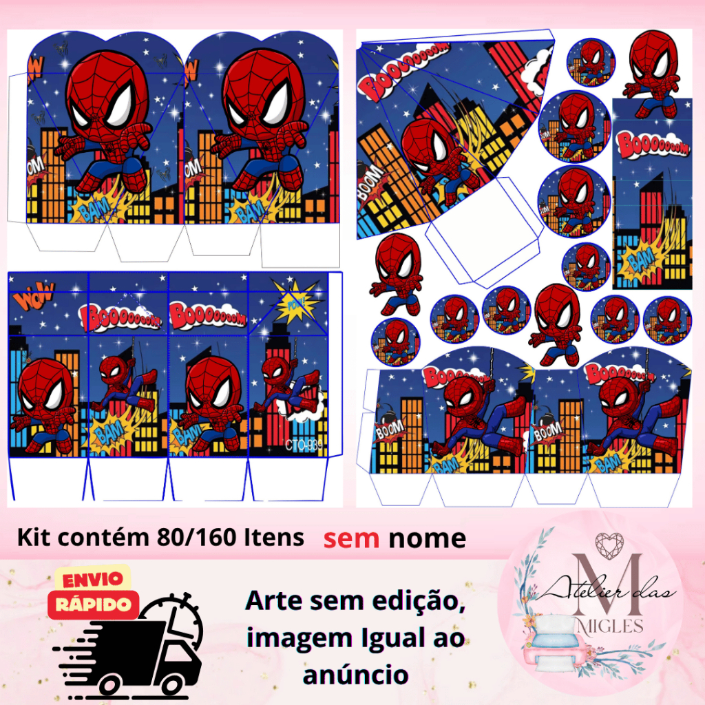 LEIA COM ATENÇÃO... LEMBRANCINHAS TEMA: HOMEM ARANHA CUTE ITENS DESMONTADOS, PODENDO COMPRAR QUANTOS KITS DESEJAR. ⬇️KIT 80 ITENS SEM ALTERAÇÃO, CONTENDO: *05 CAIXAS CORAÇÃO (11CM) *05 CAIXAS MINI CACHEPÔR (8CM) *05 CAIXAS BIS DUPLO (5CM) *05 CAIXAS MILK (14CM) *05 CAIXAS PIRÂMIDES (11CM) *10 TAGS PARA LATINHAS (5CM) *10 TAGS PARA TUBETES (5CM) *35 TAGS PARA DOCINHO (2,8CM) ⬇️KIT 160 ITENSSEM ALTERAÇÃO, CONTENDO: *10 CAIXAS CORAÇÃO (11CM) *10 CAIXAS MINI CACHEPÔR (8CM) *10 CAIXAS BIS DUPLO (5CM) *10 CAIXAS MILK (14CM) *10 CAIXAS PIRÂMIDES (11CM) *20 TAGS PARA LATINHAS (5CM) *20 TAGS PARA TUBETES (5CM) *70 TAGS PARA DOCINHO (2,8CM) OBSERVAÇÕES: SÃO FOLHAS SEM RECORTE (cliente recorta, dobra e cola); ENVIAMOS VÍDEO ILUSTRATIVO DE COMO MONTAR; PRODUZIDO EM PAPEL FOTOGRÁFICO 180G; NÃO ALTERAMOS MODELOS E NEM ARTE; NÃO INCLUSO LAÇO. IMPORTANTE SABER: As cores das fotos podem não representar fidelidade, podendo sofrer pequenas alterações por causa do monitor de cada computador, as cores podem variar de acordo com o brilho e contraste do seu monitor. Por se tratarem de produtos artesanais e únicos, podem ocorrer pequenas variações. As medidas porém sofrem pequenas diferenças em relação ao corte entre 1 e 2 milímetros.