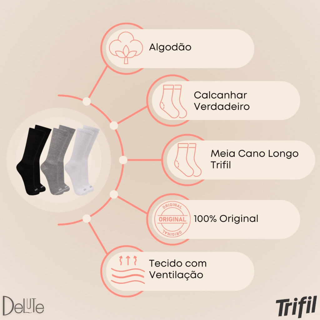 Kit com 9 Pares de Meias Cano Longo Trifil Ref: TF8013 As meias esportivas Trifil são confeccionadas com material de altíssima qualidade, possibilitando um produto macio, confortável e respirável. Possui cano longo, com punho soft, e calcanhar verdadeiro proporcionando ajuste completo aos seus pés. Perfeito para quem busca praticidade no dia a dia! - Cano longo. - Calcanhar verdadeiro. - Tecido com Ventilação. - Conforto e durabilidade. - Toque suave e ajuste preciso. Composição: Branco e Preto: Algodão 59%, Poliamida 37% e Elastano 04% Cinza: Algodão 44%, Poliamida 37%, Poliéster 15% e Elastano 04%