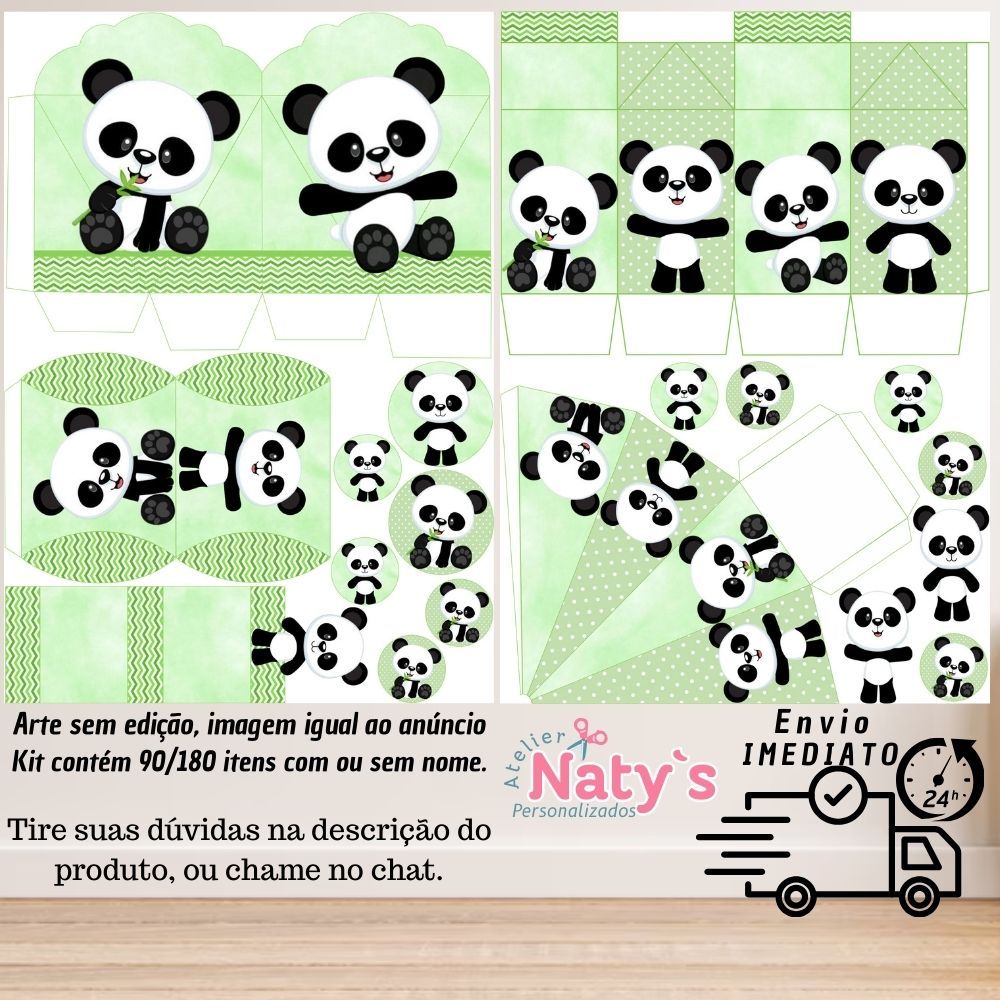 LEIA COM ATENÇÃO Arte de acordo com imagem do anúncio: PANDA Produtos sem nome: Envio Imediato (Exceto fins de semana) Produtos com nome: Envio de até 3 dias úteis Caso não seja enviado nome e idade dentro do prazo de 24H, o produto será coletado sem informações KIT CONTÉM 90 ITENS ⬇️KIT SEM ALTERAÇÃO E ARTE PADRÃO DA LOJA, CONTENDO: 05 CAIXAS CORAÇÃO (11CM) 05 CAIXAS MILK (11CM) 05 CAIXA MINI ALMOFADA (7CM) 05 CAIXAS PIRÂMIDES (12CM) 05 CAIXAS BIS DUPLO 10 TAGS PARA LATINHAS (5CM) 10 PARA TUBETES (5CM) 45 TAGS PARA DOCINHO (3CM) KIT CONTÉM 180 ITENS ⬇️KIT SEM ALTERAÇÃO E ARTE PADRÃO DA LOJA, CONTENDO: 10 CAIXAS CORAÇÃO (11CM) 10 CAIXAS MILK (11CM) 10 CAIXA MINI ALMOFADA (7CM) 10 CAIXAS PIRÂMIDES (12CM) 10 CAIXAS BIS DUPLO 20 TAGS PARA LATINHAS (5CM) 20 PARA TUBETES (5CM) 90 TAGS PARA DOCINHO (3CM) OBSERVAÇÕES: SÃO FOLHAS PARA RECORTE (cliente recorta, dobra e cola). PRODUZIDO EM PAPEL FOTOGRÁFICO 180G; KIT SEM SUBSTITUIÇÕES DE ITENS; NÃO INCLUSO LAÇOS; NÃO ACEITAMOS CANCELAMENTOS PÓS COMPRA; ENVIAMOS VÍDEO ILUSTRATIVO DE COMO MONTAR (solicitar no chat). IMPORTANTE SABER: As cores das fotos podem não representar fidelidade, podendo sofrer pequenas alterações por causa do monitor de cada computador, as cores podem variar de acordo com o brilho e contraste do seu monitor. Por se tratarem de produtos artesanais e únicos, podem ocorrer pequenas variações. As medidas porém sofrem pequenas diferenças em relação ao corte entre 1 e 2 milímetros.