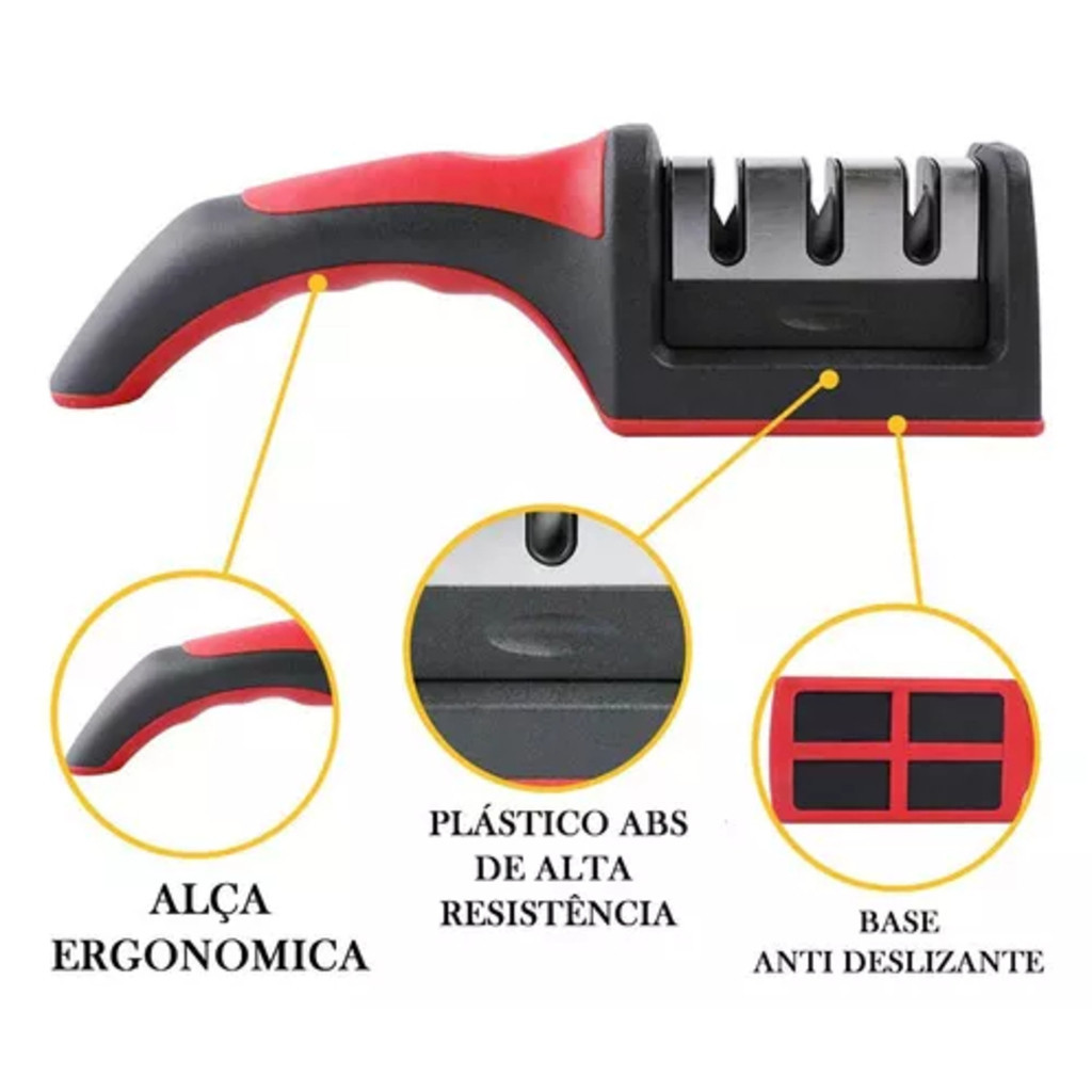 ENVIO NO MESMO DIA 🚀 Chega de sofrer com faca sem corte! O Kit Afiadore de Facas amola em segundos, de forma rápida e prática. Basta passar a lâmina no afiador em um único sentido, sem forçar. ✔ Fácil de usar ✔ Seguro e ergonômico ✔ Serve para facas, tesouras e cutelos ✔ Sistema 3 fases: Diamante + Tungstênio + Cerâmica ✔ Peça interna removível para limpeza Material: ABS + Aço Inox Conteúdo: 1 Amoladore Produto à pronta entrega. Garanta já o seu! 🔥