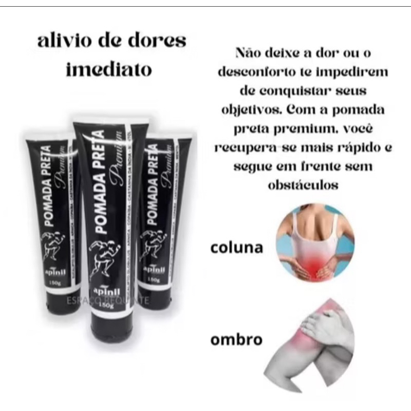 A Pomada Preta Premium da Apinil Cosméticos é um produto de alta qualidade desenvolvido para o alívio de dores musculares, articulares e contusões. Com uma fórmula especial, ela auxilia na recuperação de lesões, proporcionando uma sensação de alívio imediato e relaxamento muscular. Benefícios: ✅ Efeito analgésico e anti-inflamatório ✅ Alívio da dor muscular e articular ✅ Auxilia na recuperação de contusões e lesões leves ✅ Fórmula de rápida absorção e ação prolongada ✅ Ideal para atletas e pessoas com dores crônicas Modo de Uso: Aplique uma pequena quantidade da pomada na área afetada e massageie suavemente até a completa absorção. Utilize de 2 a 3 vezes ao dia ou conforme orientação profissional. Composição: Contém extratos naturais e ativos que proporcionam um efeito calmante e refrescante na pele. Conteúdo do Kit: 📦 3 unidades de Pomada Preta Premium de 150g cada Esse kit é ideal para quem busca um tratamento contínuo e eficiente para dores e desconfortos musculares.