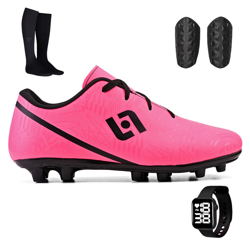 Kit com Chuteira Masculina de Futebol de Campo Trava Resistente + Meião + Caneleira e Relógio