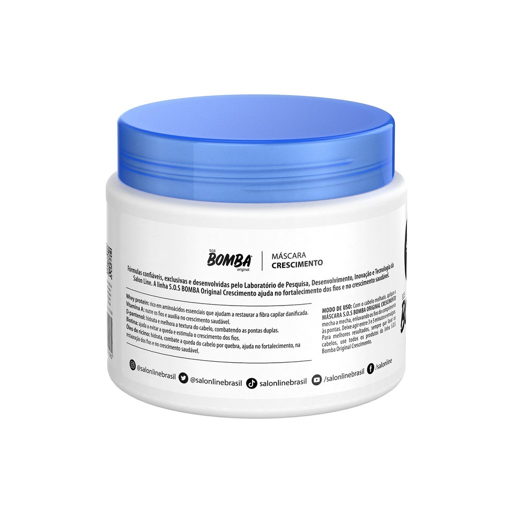 O Kit Salon Line conta com 1 Condicionador, 1 Máscara de Hidratação e 1 Tônico Fortalecedor Crescimento Acelerado S.O.S Bomba Original que, juntos, garantem hidratação, restauração, fortalecimento e estímulo para o crescimento saudável dos fios. INDICAÇÕES Para quais tipos de cabelo? Todos os tipos de cabelos. Qual a indicação? Cabelos fracos, quebradiços e com queda. Pode usar a partir de quantos anos? A partir de 12 anos. ATIVOS Quais os principais ativos? Condicionador e Máscara de Hidratação S.O.S Bomba Original Whey protein: rico em aminoácidos essenciais que restauram a fibra capilar danificada. Vitamina A: fortalece os fios e auxilia no crescimento saudável. D-pantenol: hidrata e melhora a textura da fibra, combatendo as pontas duplas. Biotina: ajuda a prevenir a queda capilar, estimula o crescimento e fortalece os fios. Óleo de rícino: hidrata, combate a queda dos fios por quebra, fortalece e recupera profundamente os cabelos, além de auxiliar no crescimento saudável. Tônico Fortalecedor S.O.S Bomba Crescimento Acelerado Café: estimula o crescimento, pois ativa a circulação do couro cabeludo e fortalece os fios. Biotina: ajuda a diminuir a queda e ainda estimula o crescimento do cabelo. Whey Protein: rico em aminoácidos que restauram as fibras capilares danificadas. MODO DE USO Qual a melhor forma de usar? Condicionador S.O.S Bomba Original Depois de lavar o cabelo com o Shampoo Salon Line Bomba, aplique o Condicionador S.O.S Bomba Original no comprimento e nas pontas. Deixe agir entre 1 e 3 minutos e enxágue. Máscara de Hidratação S.O.S Bomba Original Com o cabelo molhado, aplique a Máscara Hidratante S.O.S Bomba Original mecha a mecha, enluvando os fios do comprimento às pontas. Deixe agir de 3 a 5 minutos e enxágue. Tônico Fortalecedor S.O.S Bomba Crescimento Acelerado Couro cabeludo: depois de lavar o cabelo, aplique o tônico para crescer cabelo S.O.S Bomba Crescimento Acelerado e faça massagens circulares. Não precisa enxaguar. Sobrancelha: aplique o Tônico Salon Line fortalecedor diariamente nas sobrancelhas e faça massagens circulares. Não precisa enxaguar. CARACTERÍSTICAS É produto vegano? Os produtos não são veganos. É liberado? Apenas o Tônico Fortalecedor S.O.S Bomba Crescimento Acelerado é liberado.