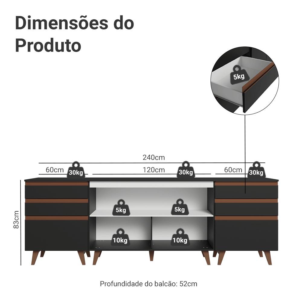 O Kit de Balcões Reims da Madesa é perfeito para quem busca aliar praticidade e estilo na organização da cozinha. Composto por um balcão de 120 cm com duas portas e dois balcões de 60cm com três gavetas em cada, oferecendo ótimo aproveitamento do espaço. Com design retrô, a linha Reims se destaca pelos pés em madeira maciça no estilo palito e pelo acabamento sofisticado. Entre os diferenciais estão os puxadores, dobradiças e corrediças metálicas. Além disso, possui tampo removível, podendo instalar pedra ou cooktop, conforme sua necessidade. Fabricado em MDP de alta qualidade, o kit une durabilidade, beleza e personalidade para transformar sua cozinha em um ambiente funcional e cheio de personalidade. Medidas totais: - 83 cm de altura - 240 cm de largura - 52 cm de profundidade Itens inclusos: - Dois (2) Balcões de 60 cm com três (3) gavetas e tampo - Um (1) Balcão de 120 cm com duas (2) portas e tampo Código do produto: GRRM2400038N Obs.: - Imagens meramente ilustrativas, a decoração não acompanha o produto - A Madesa não disponibiliza serviço de montagem - O produto segue com manual e todas as ferragens necessárias para a instalação A Madesa possui compromisso com a sustentabilidade. Geramos energia limpa em nossa própria usina, priorizamos fornecedores responsáveis e utilizamos plástico reciclado em nossa produção. Além disso, reinserimos sobras no ciclo de reciclagem e investimos no desenvolvimento de nossos colaboradores e da comunidade. Garantia: Este produto conta com 1 ano de garantia total, sendo 3 meses de garantia legal e 9 meses de garantia contratual. A garantia cobre exclusivamente defeitos de fabricação e vícios ocultos. Não estão cobertos: problemas decorrentes de montagem incorreta, uso inadequado, exposição à umidade, calor ou luz solar direta, modificações no produto ou desgaste natural.