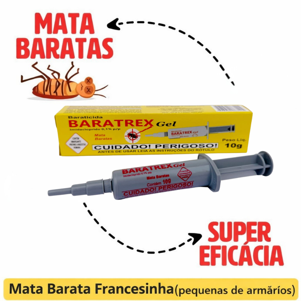Kit Combate Insetos - Imunizelar + Seringa Barata Gel, Contra insetos e Barata Francesinha Conteúdo: 1 Litro com Borrifador + 3 Seringas Barata Gel Inseticida Dedetizador Imunize lar é o seu aliado perfeito na luta contra as pragas indesejadas que insistem em invadir sua casa. Com formulação altamente eficaz, esse poderoso dedetizador é capaz de acabar com pulgas, baratas, moscas, traças, formigas, cupins, pernilongos, muriçocas, aranhas, carrapatos e muito mais. Você pode ver o efeito imediato do Inseticida dedetizador Imunize lar, eliminando as pragas de forma rápida e precisa. Sua fórmula n ão tóxica garante a sua segurança e a de sua família, sem comprometer a saúde ou o meio ambiente. Além disso, o produto não deixa cheiro, garantindo que sua casa permaneça fresca e agradável. Com o Dedetizador Imunize lar, você não precisa se preocupar com aquela desagradável sensação de estar inalando produtos químicos durante a aplicação. Esse dedetizador não vem com borrifador, o que permite que você utilize o método de aplicação que preferir. Seja ele atomizador, pano umedecido ou qualquer outro. Você escolhe a forma mais prática e eficaz de utilização. Outra grande vantagem do Dedetizador Imunize lar é que ele não mancha. Dessa forma, você pode aplicar tranquilamente em qualquer superfície, seja ela de tecido, madeira, cerâmica, plástico, entre outros. Não importa o material, o Dedetizador Imunize lar irá eliminar as pragas sem deixar marcas indesejadas. Sinta-se seguro e protegido em sua própria casa com o Dedetizador Imunize lar. Com sua eficácia comprovada, ele é a solução ideal para acabar com as pragas que prejudicam sua qualidade de vida. Escolha uma opção confiável e eficiente. Escolha o Dedetizador Imunize lar e livre-se definitivamente da presença indesejada desses pequenos invasores. GEL MATA BARATA SERINGA 10G ELIMINA NINHO BARATA GERMANICA E AMERICANA BARATAGEL vem pronto para uso em seringa plástica contendo 10g. Uso exclusivo em ambientes domésticos para o controle de baratas, principalmente as espécies germânicas e americanas. Para aplicar basta retirar a tampa e apertar o êmbolo depositando pequenas gotas nos locais onde as baratas aparecem. O produto deve ser aplicado em pequenas fendas, rachaduras, embaixo de pias, mesas, balcões e atrás de armários, ou seja, aplicar o produto onde as baratas costumam frequentar. A quantidade a ser aplicada deve ser equivalente a 0,6g/m2 ou aproximadamente 6 a 8 pontos de aplicação por metro quadrado. Após o uso tampe o bico da seringa, mantenha em local seco, ao abrigo de temperatura excessiva e fora do alcance de crianças e animais domésticos.