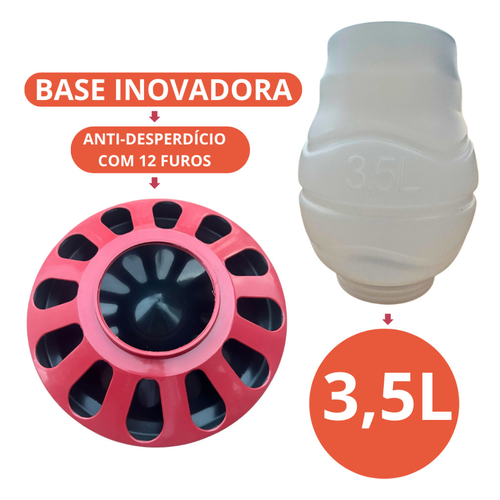 Escolha o Kit que melhor te atenda, temos as seguintes opções: 2 UNIDADES - COMEDOURO 3,5KG 3 UNIDADES - COMEDOURO 3,5KG 4 UNIDADES - COMEDOURO 3,5KG 5 UNIDADES - COMEDOURO 3,5KG 6 UNIDADES - COMEDOURO 3,5KG CONTÉM: - COMEDOURO 3,5kg COM 12 FUROS Benefícios: - Funcional e eficiente - Desmontável para facilitar a limpeza - Fabricado em plástico resistente e atóxico - Ideal para ração, quirera, milho. - Indicado para: Frangos, Pintinhos, Galinhas, Codorna, Garnisé, Galo, Perdiz, Pombos, Pavão, Faisão, Pássaros Silvestres, etc.