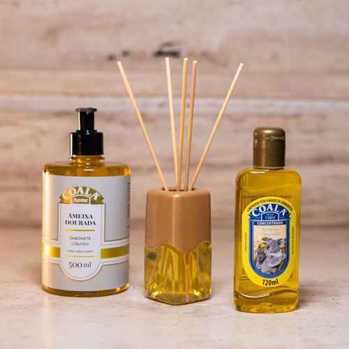Coala Difusor de Aromas Ameixa Dourada Coala Difusor de Aromas é um excelente aromatizador de ambientes, mantendo o perfume por mais tempo. Além de garantir o aroma, o jogo de varetas que acompanha o produto compõe com o frasco e decora o ambiente com design moderno. Com a variedade de fragrâncias é possível variar o uso entre os ambientes, garantindo sensações únicas em cada um. O Difusor de Aromas Coala garante uma sensação confortável e duradoura no ambiente. Para ter o melhor resultado no uso, confira algumas dicas: Limpador Perfumado de Ambientes Ameixa Dourada Com Coala Essências - Limpador Perfumado de Ambientes Ameixa Dourada, seu ambiente vai ficar limpo e com um aroma incrível. Além de poder ser usada em todos os ambientes, a Coala Essências - Limpador Perfumado de Ambientes Ameixa Dourada também: - Garante a sensação prolongada de limpeza e bem-estar; - Tem perfume duradouro, - Fragrância agradável. Sabonete Liquido Ameixa Dourada 500ml O Sabonete Líquido Ameixa Dourada Coala é o que faltava no seu dia-a-dia. Sua fórmula limpa delicadamente sua pele, deixando seu rosto, suas mãos e seu corpo macio e cheiroso.