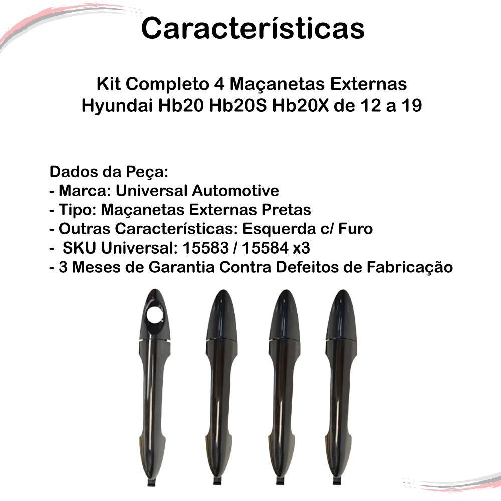 Olá, bem-vindo a Shoppeças!O melhor lugar para você comprar as peças e acessórios para o seu veículo.Somos uma empresa especializada em E-COMMERCE e disponibilizamos um portfólio de mais de 30 mil itens no setor Automotivo. Dentro dos segmentos de ferragens automotivas (fechaduras, maçanetas, cilindros, trincos de quebra vento), máquinas do vidro Elétrica s e manuais, tampas automotivas, borrachas de vedação, linha de suspensão e direção, amortecedores mola a gás, acessórios automotivos e palhetas.Possuímos o claro propósito de facilitar a vida das pessoas, ofertando produtos que permitirão segurança, conforto e que agregam valores a vida de cada um.TODA COMPRA APROVADA ATÉ ÀS 14H É ENVIADA NO MESMO DIA!Dúvidas? Fale com a gente pelo campo "Pergunte ao vendedor.-Peça original Universal Automotive, a melhor marca para peças de reposição do mercado!-Dispense peças paralelas e 2ª linhas. Compre com garantia!A SUA SATISFAÇÃO OU O SEU DINHEIRO DE VOLTA!-CONTEÚDO DA EMBALAGEMKit Completo de 4 Maçanetas Externas – Portas Dianteira eiras e Traseiras (Esquerda Dianteira Com furo / Sem chave) - Lados Esquerdo e DireitoAPLICAÇÃOHB20 – 2012 Até 2019HB220s – 2012 Até 2019HB20x – 2014 Até 2016IDENTIFICAÇÃO DO PRODUTOMarca: Universal AutomotiveSKU Universal: 15583 / 15584 x3COM GARANTIA DE 3 MESESINSTALAÇÃO:Este é um produto técnico e deve ser aplicado por um profissional, assim se garante a longa vida útil dele.
