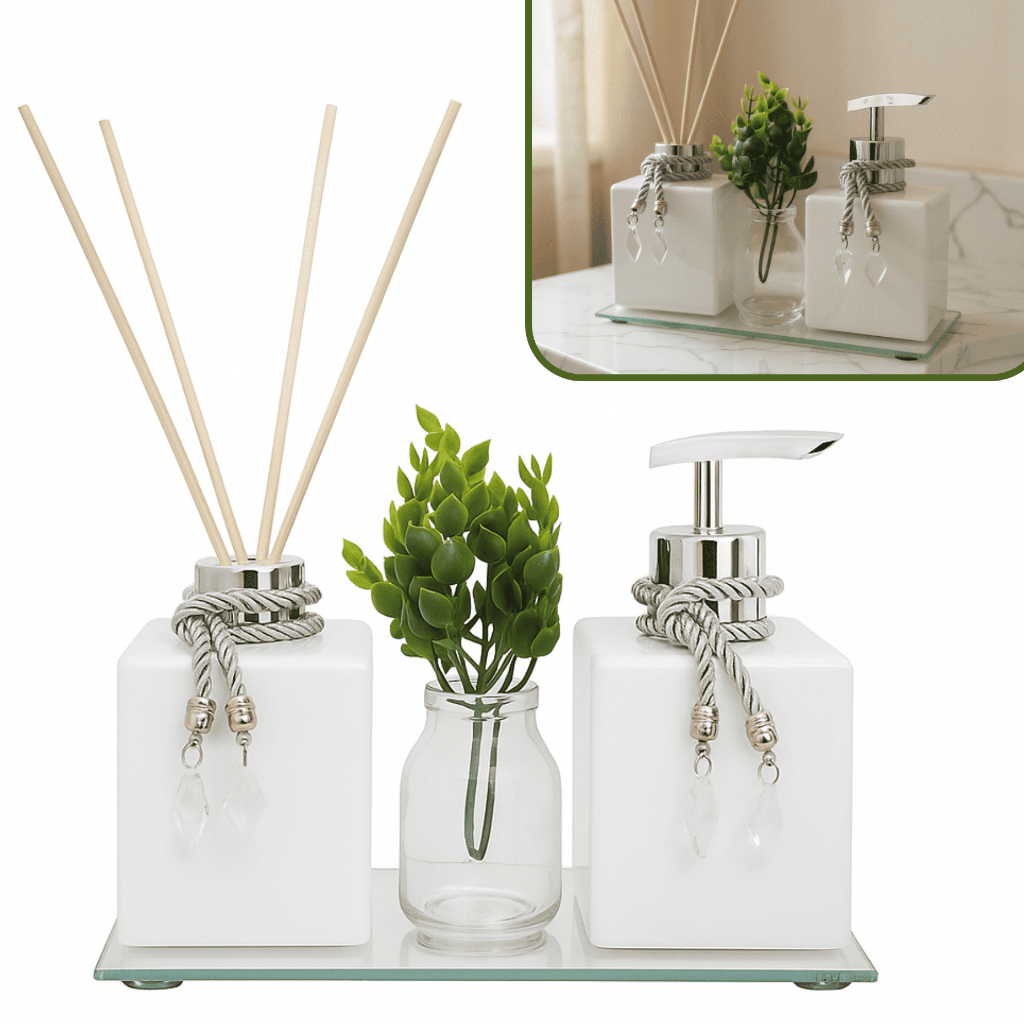 Kit Completo Banheiro Vidro Cubo 250ml Difusor e Porta Sabonete Com Bandeja Espelhada e Vaso Planta