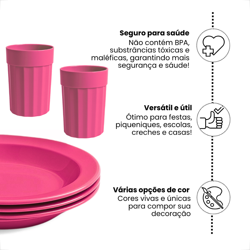 Kit 4 Pratos Fundos + 4 Copos 350ml – Praticidade, Cores Vibrantes e Funcionalidade para o Dia a Dia! Transforme suas refeições em momentos ainda mais práticos e alegres com este kit completo e colorido, ideal para o uso diário em casa, escolas, empresas, refeitórios ou eventos. O conjunto é composto por 4 pratos fundos e 4 copos plásticos de 350ml, fabricados em material resistente, leve, atóxico e livre de BPA. ITENS INCLUSOS: >> 4 Pratos Fundos Redondos – Ideais para sopas, massas, saladas e refeições completas - Diâmetro: 23 cm | Formato: Redondo e fundo >> 4 Copos Plásticos – Capacidade de 350ml cada - Altura: 11 cm | Diâmetro: 8 cm | Perfeitos para sucos, água, vitaminas e outras bebidas frias CORES DISPONÍVEIS: - Rosa, Azul Claro, Tiffany, Verde, Amarelo, Roxo, Azul Escuro, Preto, Vermelho, Laranja e Cores Variadas * CORES VARIADAS enviado de acordo com disponibilidade de estoque * PRINCIPAIS BENEFÍCIOS: - Cores Alegres e Funcionais – Visual moderno que facilita a organização da mesa - Leves e Empilháveis – Fácil de guardar, organizar e transportar - Fácil de Higienizar – Pode ser lavado à mão ou na lava-louças - Versátil e Compacto – Ideal para o uso doméstico, escolar, eventos e até acampamentos Se você busca funcionalidade com um toque de cor, esse kit é a escolha certa! Garanta já o seu e leve mais estilo, leveza e praticidade para as suas refeições!