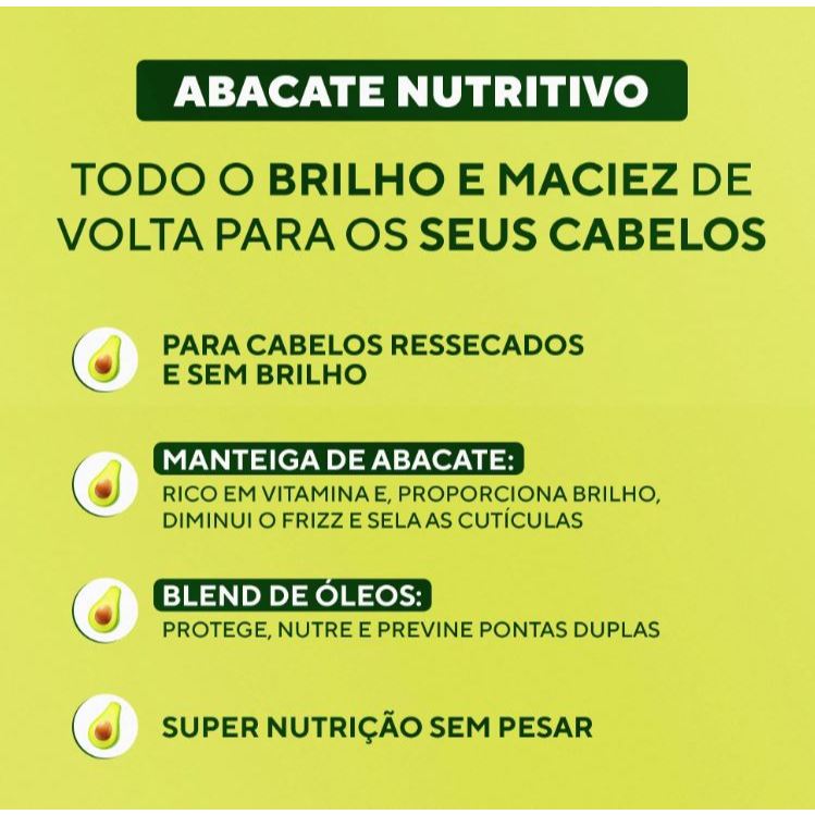 Kit DaBelle Hair Intense Abacate Nutritivo Completo (6 Produtos): Contém: DaBelle Hair Abacate Nutritivo - Shampoo 250ml, DaBelle Hair Abacate Nutritivo - Condicionador 175ml, DaBelle Hair Abacate Nutritivo - Creme de pentear 270g, DaBelle Hair Abacate Nutritivo - Óleo em Creme 190ml, DaBelle Hair Máscara Abacate Nutritivo 400g, DaBelle Hair Intense Abacate Nutritivo- Óleo Reparador 75ml. Que tal um cabelo super nutrido com uma fórmula especial? DaBelle Hair Abacate Nutritivo - Shampoo 250ml: O Shampoo Abacate Nutritivo remove as impurezas com muito cuidado e deixa seus cabelos prontos para receber o tratamento. DaBelle Hair Abacate Nutritivo - Condicionador 175ml: O Condicionador Abacate Nutritivo alinha as cutículas para te proporcionar um desembaraço incrível, eliminando a aspereza e as pontas duplas. DaBelle Hair Abacate Nutritivo - Creme de pentear 270g: O Creme de Pentear Abacate Nutritivo tem o poder de devolver a maciez e o brilho para a fibra capilar. Além de conficionar, nutre sem pesar deixando seus cabelos livres do frizz. DaBelle Hair Abacate Nutritivo - Óleo em Creme 190ml: O Óleo em Creme Abacate Nutritivo possui uma fórmula inovadora e multifuncional. Com textura leve, condiciona e traz muito brilho aos cabelos. Ideal para te proteger também na praia, piscina, do vento e do sol. DaBelle Hair Máscara Abacate Nutritivo 400g: A Máscara de Nutrição tem o poder de devolver os óleos e nutrientes essenciais para a fibra capilar. Retém a hidratação dentro do fio, combatendo o ressecamento dos cabelos ásperos e sem vida. Traz de volta o vigor e o condicionamento com muita maciez e proteção. DaBelle Hair Intense Abacate Nutritivo- Óleo Reparador 75ml: O Óleo Reparador Abacate Nutritivo tem a textura leve e ajuda a suavizar o ressecamento, repara as pontas duplas, condiciona os fios, além de protegê-los contra as agressões diárias do secador e da chapinha. É um super anti-frizz e adiciona uma dose extra de brilho. COMPLEXO NUTRITIVO: MANTEIGA DE ABACATE: Rica em Vitamina E, repõe os lipidios e combate o ressecamento. BLEND DE ÓLEOS: Com Argan, Abacate, Macadâmia, Girassol e Linhaça Uma combinação perfeita que protege, nutre com leveza, dá brilho e previne as pontas duplas. 0%: SULFATOS, PARABENOS, CORANTES E SAL