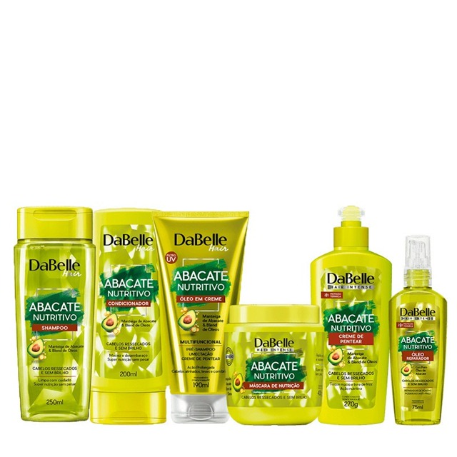 Kit DaBelle Hair Intense Abacate Nutritivo Full 400g (6 Produtos): Contém: DaBelle Hair Abacate Nutritivo - Shampoo 250ml, DaBelle Hair Abacate Nutritivo - Condicionador 175ml, DaBelle Hair Abacate Nutritivo - Creme de pentear 270g, DaBelle Hair Abacate Nutritivo - Óleo em Creme 190ml, DaBelle Hair Máscara Abacate Nutritivo 400g, DaBelle Hair Intense Abacate Nutritivo- Óleo Reparador 75ml. Que tal um cabelo super nutrido com uma fórmula especial? DaBelle Hair Abacate Nutritivo - Shampoo 250ml: O Shampoo Abacate Nutritivo remove as impurezas com muito cuidado e deixa seus cabelos prontos para receber o tratamento. DaBelle Hair Abacate Nutritivo - Condicionador 175ml: O Condicionador Abacate Nutritivo alinha as cutículas para te proporcionar um desembaraço incrível, eliminando a aspereza e as pontas duplas. DaBelle Hair Abacate Nutritivo - Creme de pentear 270g: O Creme de Pentear Abacate Nutritivo tem o poder de devolver a maciez e o brilho para a fibra capilar. Além de conficionar, nutre sem pesar deixando seus cabelos livres do frizz. DaBelle Hair Abacate Nutritivo - Óleo em Creme 190ml: O Óleo em Creme Abacate Nutritivo possui uma fórmula inovadora e multifuncional. Com textura leve, condiciona e traz muito brilho aos cabelos. Ideal para te proteger também na praia, piscina, do vento e do sol. DaBelle Hair Máscara Abacate Nutritivo 400g: A Máscara de Nutrição tem o poder de devolver os óleos e nutrientes essenciais para a fibra capilar. Retém a hidratação dentro do fio, combatendo o ressecamento dos cabelos ásperos e sem vida. Traz de volta o vigor e o condicionamento com muita maciez e proteção. DaBelle Hair Intense Abacate Nutritivo- Óleo Reparador 75ml: O Óleo Reparador Abacate Nutritivo tem a textura leve e ajuda a suavizar o ressecamento, repara as pontas duplas, condiciona os fios, além de protegê-los contra as agressões diárias do secador e da chapinha. É um super anti-frizz e adiciona uma dose extra de brilho. Original - Envio Rápido com Nota Fiscal.