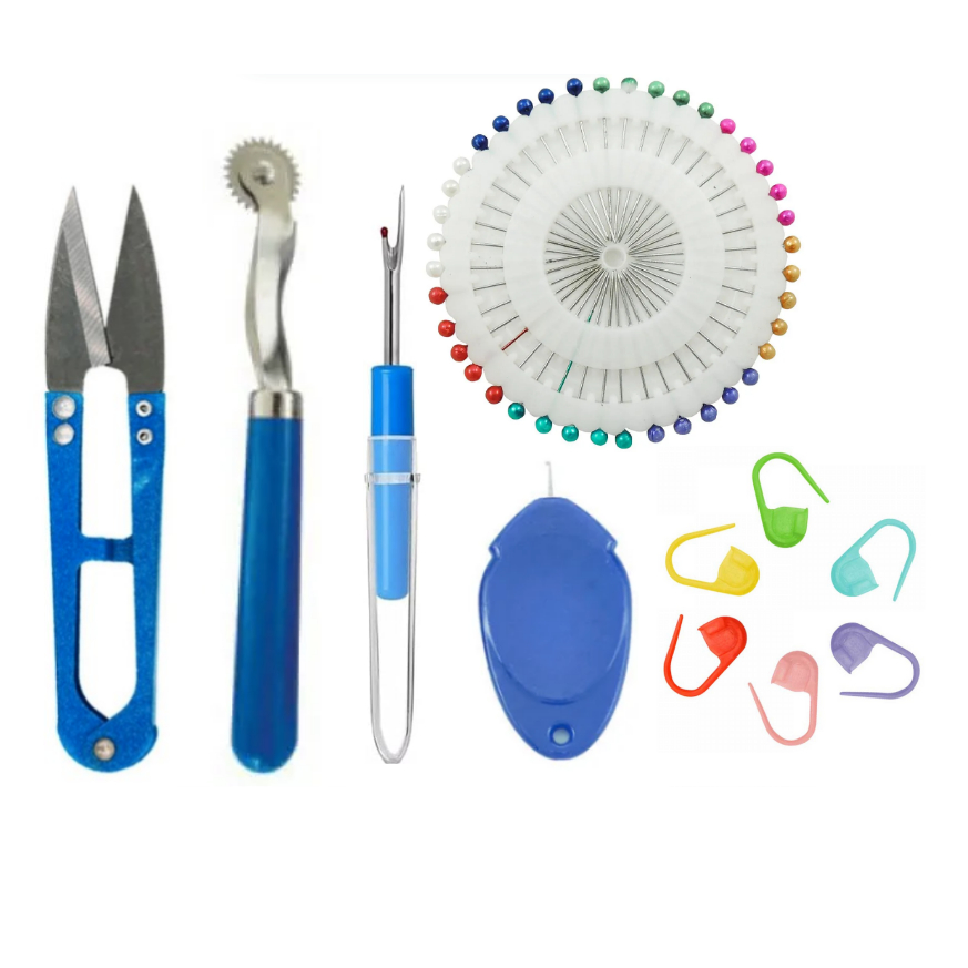 Kit Completo de Costura Tesoura Arremate Passa linha Abridor de casa Carretilha Marca Ponto 40 Alfinetes
