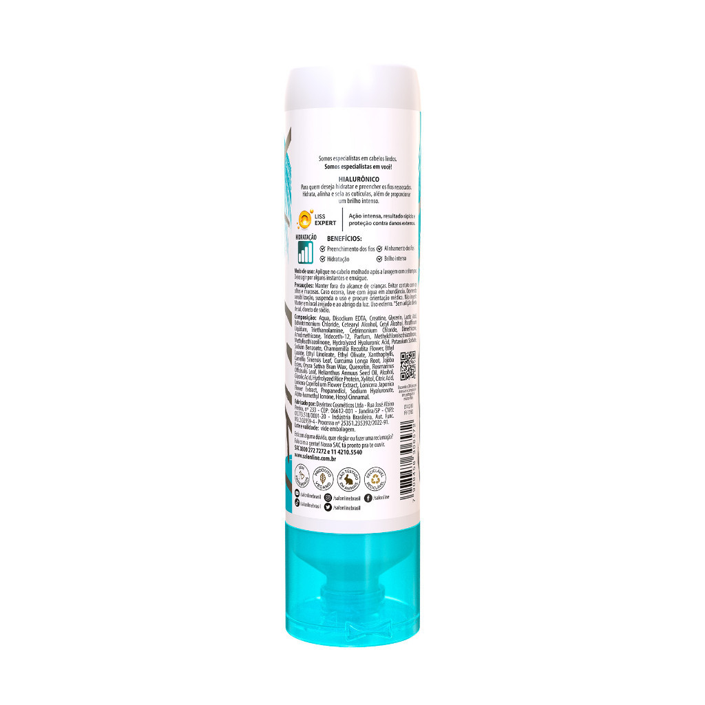 O Kit Salon Line Meu Liso conta com 1 Shampoo, 1 Condicionador, 1 Máscara de Hidratação e 1 Defrizante Spray Protetor Térmico da linha SPA Capilar Ácido Hialurônico. Combinados, garantem restauração e reparação das fibras capilares, hidratação profunda, elasticidade, brilho e proteção térmica contra os danos das ferramentas de calor. INDICAÇÕES Para quais tipos de cabelo? Cabelos lisos naturais, alisados e relaxados. Qual a indicação? Cabelos danificados e quimicamente tratados. . Pode usar a partir de quantos anos? A partir de 12 anos ATIVOS Quais os principais ativos? A linha Meu Liso SPA Capilar Ácido Hialurônico conta com ácido hialurônico para cabelo que garante restauração capilar, reposição de massa e controle do frizz. MODO DE USO Qual a melhor forma de usar? Shampoo Meu Liso SPA Capilar Ácido Hialurônico Aplique o Shampoo com Ácido Hialurônico no cabelo molhado, massageando suavemente. Enxágue bem. Caso seja necessário, repita a aplicação. Condicionador Meu Liso SPA Capilar Ácido Hialurônico Após lavar o cabelo com o Shampoo Ácido Hialurônico Meu Liso Spa Capilar, aplique o Condicionador com Ácido Hialurônico nos cabelos úmidos, mecha a mecha, do comprimento às pontas dos fios. Enxágue bem. Máscara de Hidratação Meu Liso SPA Capilar Ácido Hialurônico Com o cabelo limpo e úmido, aplique a Máscara Hidratante com Ácido Hialurônico mecha por mecha, massageando no sentido da raiz para as pontas. Deixe agir entre 5 e 10 minutos. Enxágue bem. Defrizante Spray Protetor Térmico Meu Liso SPA Capilar Ácido Hialurônico Com o cabelo limpo, borrife o Defrizante Protetor Térmico Spray mecha a mecha, espalhando com as mãos ou com um pente. Inicie o processo de escovar com um secador e, se desejar, finalize com a prancha. CARACTERÍSTICAS É produto vegano? Os produtos com ácido hialurônico da linha Meu Liso Spa Capilar são veganos. É liberado? Os produtos não são liberados, mas não possuem sal. Além disso, o Shampoo, o Condicionador e a Máscara de Hidratação não tem parabenos.
