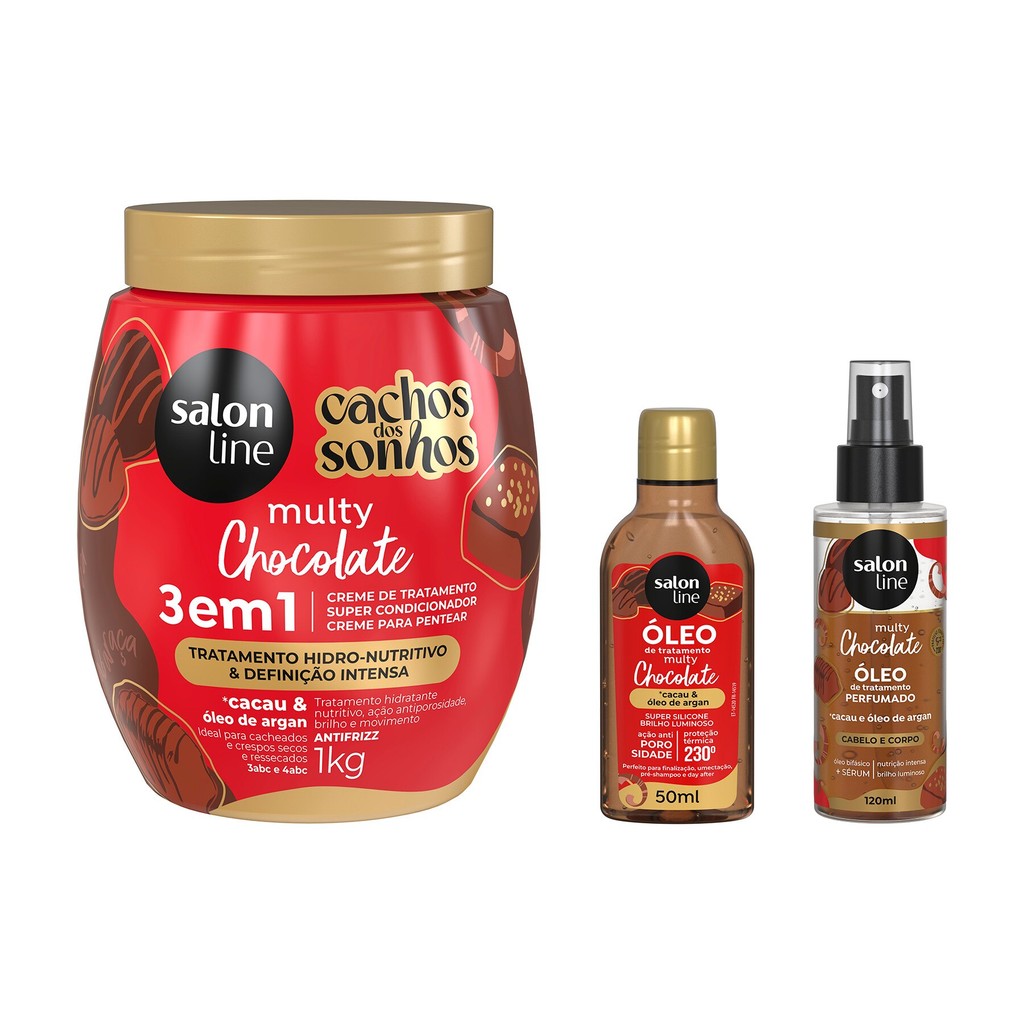O kit contém 1 Creme de Tratamento Multy Chocolate Hidro Nutrição 1kg, 1 Óleo de Tratamento Multy Chocolate Super Silicone 50ml e 1 Óleo Perfumado Cabelo e Corpo Multy Chocolate 120ml, a combinação ideal para hidratar, nutrir e controlar a porosidade dos fios. Juntos, promovem nutrição intensa, selagem das cutículas, redução do frizz e proteção contra o ressecamento, deixando os cabelos macios, alinhados e com brilho. <>INDICAÇÕES$& Para quais tipos de cabelo? Cabelos Cacheados e Crespos. Qual a indicação? Cabelos desidratados, desnutridos, com porosidade e com frizz. Para pele ressecada. Pode usar a partir de quantos anos? A partir de 12 anos. <>ATIVOS$& Quais os principais ativos? Óleo Perfumado Cabelo e Corpo Multy Chocolate, Óleo de Tratamento Cachos dos Sonhos Multy Chocolate, Creme de Tratamento 3 em 1 Cachos dos Sonhos Multy Chocolate Manteiga de Cacau: nutre profundamente, suaviza os fios e combate o ressecamento. Óleo de Argan: evita a perda de água natural dos fios, promove hidratação e nutrição. <>MODO DE USO$& Qual a melhor forma de usar? Creme de Tratamento 3 em 1 Cachos dos Sonhos Multy Chocolate Creme de tratamento: Com os cabelos limpos e úmidos, aplique o produto mecha a mecha, enluvando os fios da raiz até as pontas. Deixe agir por 5 minutos e enxágue bem. Condicionador: Com os cabelos limpos e úmidos, aplique o produto e massageie os fios do comprimento até as pontas. Enxágue bem. Creme para pentear: Com os cabelos limpos e úmidos, aplique o produto mecha a mecha, uniformemente, no comprimento e nas pontas. Desembarace os fios com um pente de dentes largos e amasse-os, iniciando o movimento das pontas até a raiz. A aplicação ideal dependerá da quantidade e do comprimento dos fios. Não enxágue. Óleo Perfumado Cabelo e Corpo Multy Chocolate Cabelo: Com os cabelos úmidos ou secos, aplique o óleo nas mãos e espalhe uniformemente entre os fios. Pode ser utilizado como protetor térmico antes do uso de ferramentas de calor, perto da raiz para umectação dos fios ou ao longo do dia para perfumar os cabelos. Corpo: Espalhe pelo corpo e nas regiões mais ressecadas, como cotovelos e pernas. Óleo de Tratamento Cachos dos Sonhos Multy Chocolate Com o cabelo seco ou úmido, aplique algumas gotas do óleo de tratamento na palma das mãos e espalhe bem do comprimento às pontas. Finalize como preferir. Sem enxágue. <>CARACTERÍSTICAS$& É produto vegano? Apenas o óleo perfumado e o creme multy chocolate são veganos. É liberado? Os produtos não são liberados.