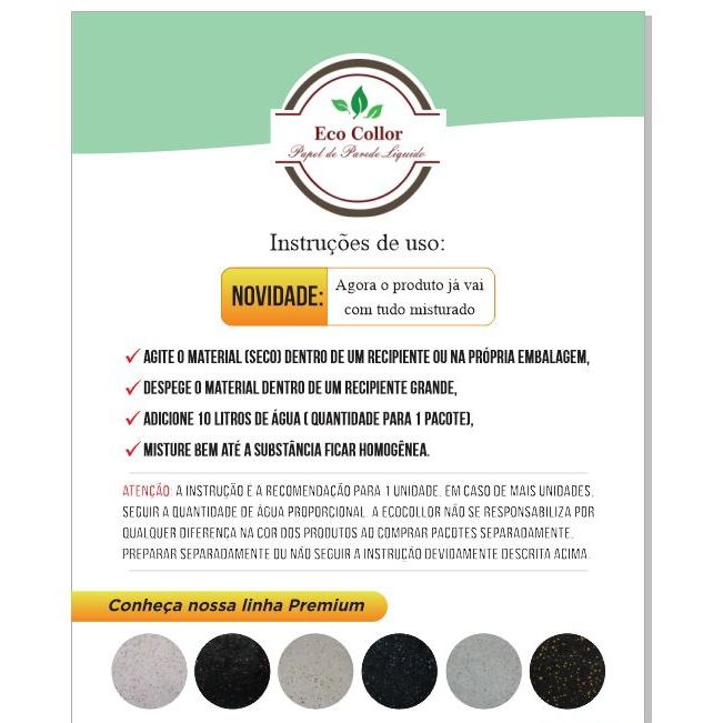 ATENÇÃO, agora o material já vai misturado com a cola!!! basta prepara-lo com água. Rendimento: APROXIMADAMENTE 5m² - pedimos que tire as medidas de sua parede e compre uma quantidade compatível, pois, existe diferença na tonalidade quando aplicado em momentos diferentes. A ECOCOLLOR não se responsabiliza por diferença de tonalidade que poderá surgir ao não cumprir a recomendação. ATENÇÃO: existe diferença de rendimento a depender do tipo de superfície a ser aplicado (consultar vendedor) Componentes: Fibra de algodão - Glitter (cor selecionada - já misturado); - Mica em Flocos (já misturado); - cola em pó (JÁ MISTURADO); - Passo a passo impresso (já misturado); - Uma Desempenadeira Plástica Lisa cor Preta; OBS: Acima de 2 kits mandamos apenas 2 desempenadeiras. O material é super simples de preparar: 1º Despeje todo o material, dentro de um grande recipiente; 2º Adicione cerca de 10 litros de água; 3º Misture bem até a massa começar a fica viscosa; 4º Depois só aplicar. Benefícios: Produto Ecológico; Inodoro; Não suja; Aplicação simples; Tratamento acústico (Parcial); Mantém temperatura ambiente; - Quando for utilizar mais de 1 pacote na mesma parede, É OBRIGATÓRIA A MISTURA DE TODOS OS PACOTES JUNTOS ANTES DA APLICAÇÃO, a ECOCOLLOR não se responsabiliza pela diferença de tonalidade que poderá surgir ao não cumprir a recomendação. - Em casos de cálculo errado de metragem e faltar produto para terminar a parede, É OBRIGATÓRIA A RETIRADA DO PRODUTO APLICADO PARA SER MISTURADO AO NOVO PRODUTO PARA APLICAÇÃO, a ECOCOLLOR não se responsabiliza por diferença de tonalidade que poderá surgir ao não cumprir a recomendação. ATENÇÃO: Este é um produto natural e artesanal, fabricado com fibras de algodão, mica e pigmentos minerais. Por essa razão, pode haver pequenas variações de tonalidade entre lotes, sem qualquer prejuízo à qualidade, rendimento ou acabamento final. Essas variações são características do processo natural de produção e não configuram defeito do produto. Tire suas dúvidas que responderemos!! :)