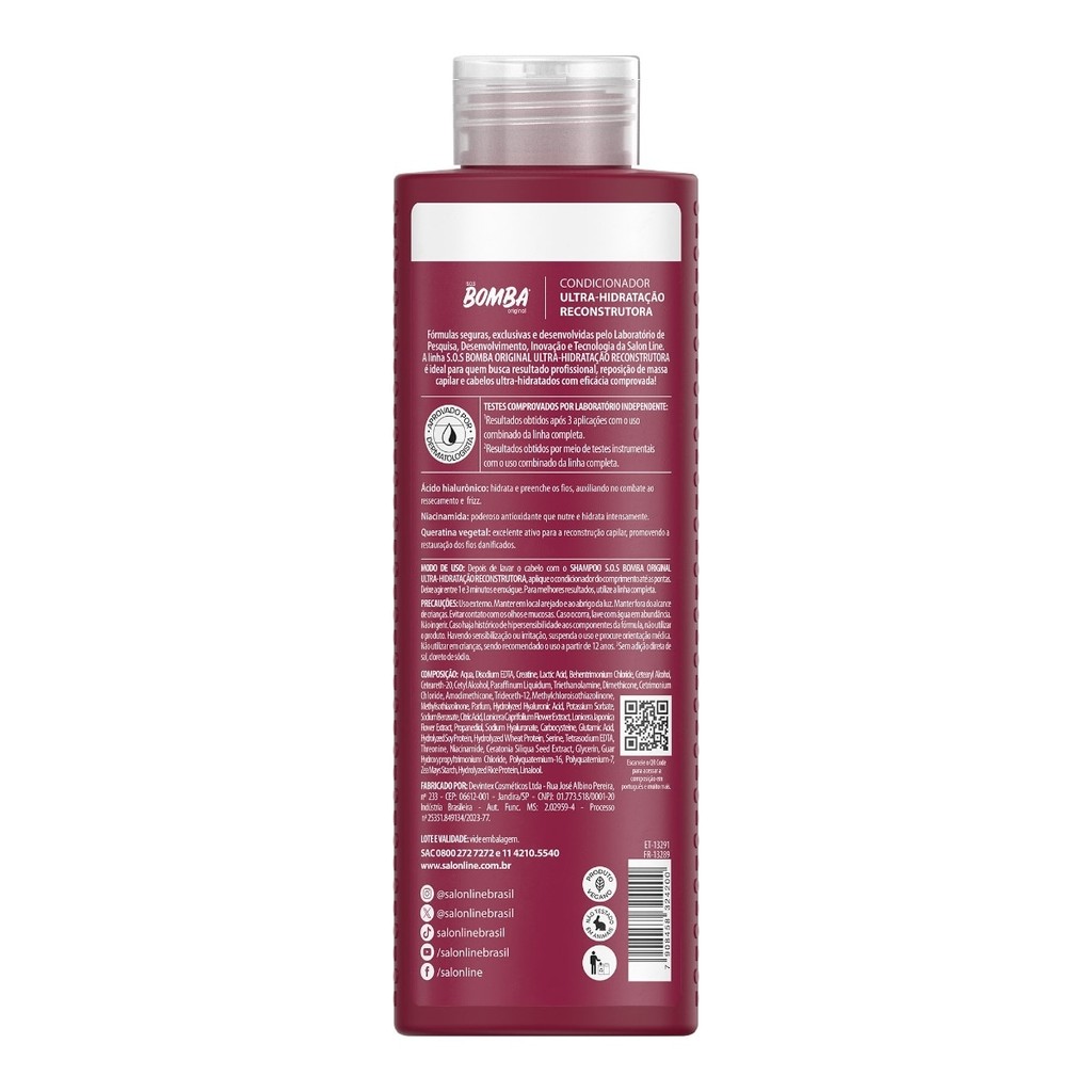 O Kit completo conta com um Shampoo, Condicionador, Máscara e Creme para pentear SOS Bomba Ultra-Hidratação Reconstrutora. Esse combo garante 10x mais hidratação, 72h de tratamento profundo além de brilho e maciez. <>INDICAÇÕES$& Para quais tipos de cabelo? Todos os tipos de cabelos. Qual a indicação? Cabelos ressecados e danificados. Pode usar a partir de quantos anos? A partir de 12 anos. <>ATIVOS$& Quais os principais ativos? Shampoo, Condicionador, Máscara e Creme para Pentear SOS Bomba Ultra-Hidratação Ácido hialurônico: hidrata e preenche os fios, auxiliando no combate ao ressecamento e frizz. Niacinamida: poderoso antioxidante que nutre e hidrata intensamente. Queratina vegetal: excelente ativo para a reconstrução capilar, promovendo a restauração dos fios danificados. <>MODO DE USO$& Qual a melhor forma de usar? Shampoo SOS Bomba Ultra-Hidratação Reconstrutora Aplique o Shampoo uniformemente no cabelo molhado. Massageie a raiz até formar espuma. Enxágue e, se necessário, reaplique o produto. Para melhores resultados, utilize a linha completa. Condicionador SOS Bomba Ultra-Hidratação Reconstrutora Depois de lavar os cabelos, aplique o Condicionador do comprimento até as pontas. Deixe agir de 1 a 3 minutos e enxágue. Creme para Pentear SOS Bomba Ultra-Hidratação Reconstrutora Com o cabelo limpo e úmido, aplique o Creme para pentear mecha a mecha, do comprimento às pontas. Não enxágue. Máscara SOS Bomba Ultra-Hidratação Reconstrutora Com o cabelo molhado, aplique a Máscara de Tratamento Intensivo mecha a mecha, enluvando os fios da raiz às pontas. Deixe agir entre 3 e 5 minutos e enxágue. <>CARACTERÍSTICAS$& É produto vegano? Todos são veganos. É liberado? Nenhum dos produtos são liberados.