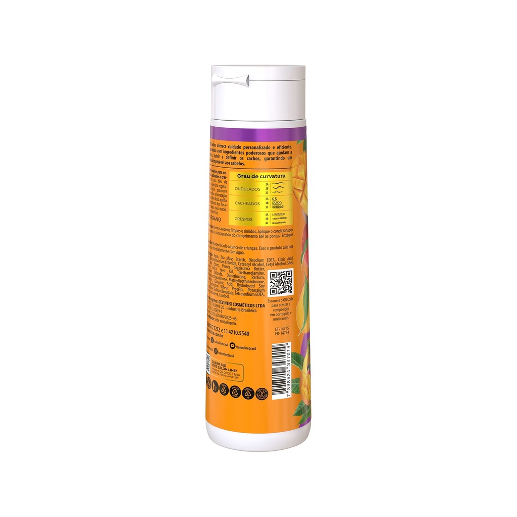O Kit Salon Line Óleo de Manga S.O.S Cachos contém 1 Shampoo, 1 Condicionador, 1 Ativador de Cachos, 1 Creme para Pentear e 1 Máscara de Hidratação da linha S.O.S Cachos Óleo de Manga Ultra-hidratação. Juntos, garantem limpeza suave, hidratação profunda dos cabelos cacheados, crespos e ondulados, selagem das cutículas, além de ativar e definir os cachos e devolver o brilho e a luminosidade ao cabelo.INDICAÇÕESPara quais tipos de cabelo?Cabelos ondulados, cacheados e crespos.Qual a indicação?Cabelos desidratados.Pode usar a partir de quantos anos?A partir de 12 anos.ATIVOSQuais os principais ativos?Óleo de manga: rico em vitaminas e sais minerais para os cabelos, os benefícios do óleo de manga incluem ação hidratante e nutritiva, fortalecimento dos fios, brilho intenso e um cabelo ultramacio.Queratina vegetal: excelente para uma reconstrução capilar profunda, devolve os nutrientes que o cabelo perde ao longo do tempo.MODO DE USOQual a melhor forma de usar?Shampoo S.O.S CachosAplique o Shampoo Óleo de Manga S.O.S Cachos Ultra-hidratação uniformemente no cabelo molhado. Massageie suavemente até formar espuma. Enxágue.Condicionador S.O.S CachosApós usar o Shampoo de Manga, aplique o Condicionador S.O.S Cachos Óleo de Manga Ultra-definição uniformemente no cabelo molhado. Massageie e deixe agir entre 1 e 3 minutos. Enxágue.Ativador de Cachos S.O.S CachosCom o cabelo limpo e úmido, aplique o Ativador de Cachos Óleo de Manga S.O.S Cachos Ultra-hidratação mecha a mecha, uniformemente, do comprimento às pontas. Se desejar mais controle do volume, aplique também próximo da raiz. Desembarace os fios com um pente de dentes largos e, em seguida, amasse-os iniciando o movimento das pontas até a raiz. Repita o movimento quantas vezes forem necessárias, auxiliando na formação dos cachos. A quantidade ideal a ser aplicada dependerá da quantidade de cabelo e do comprimento dos fios.Creme para Pentear S.O.S CachosCom o cabelo limpo e úmido, aplique o Creme de Pentear Óleo de Manga S.O.S Cachos Ultra-hidratação mecha a mecha, uniformemente, do comprimento às pontas. Se desejar mais controle do volume, aplique também próximo da raiz. Desembarace os fios com um pente de dentes largos e, em seguida, amasse-os iniciando o movimento das pontas à raiz. Repita o movimento quantas vezes forem necessárias, auxiliando na formação dos cachos. A quantidade ideal a ser aplicada dependerá da quantidade de cabelo e do comprimento dos fios.Máscara de Hidratação Intensa S.O.S CachosApós lavar o cabelo, aplique a Máscara de Hidratação Intensa S.O.S Cachos Óleo de Manga Ultra-hidratação mecha por mecha, massageando no sentido da raiz às pontas. Deixe agir entre 3 e 5 minutos. Enxágue.CARACTERÍSTICASÉ produto vegano?Os produtos são veganos.É liberado?Os produtos não são liberados, mas o Shampoo, o Condicionador e a Máscara não possuem parabenos, além disso, o Shampoo não possui sal.