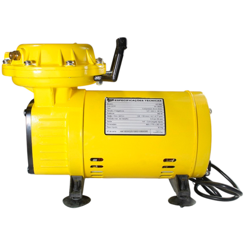 Conteúdo da Embalagem 1 Compressor de Ar Direto Jet Max — Modelo AD 500 1 Manual de instruções / Certificado de garantia (a preencher no ato da venda) 1 Pistola de pintura com copo (modelo para acabamento; copo acoplável) 1 Mangueira espiral para ar comprimido (com engate rápido em ambas as pontas) Descrição do Produto O Compressor Jet Max AD 500 é uma solução compacta e prática para quem precisa de ar comprimido em tarefas leves e médias. Com motor de 360 W e vazão aproximada de 128–135 L/min, o AD500 atende com eficiência pistolas de pintura de baixa demanda, ferramentas pneumáticas de pequeno porte e serviços de calibragem e limpeza. O kit entregue inclui pistola de pintura e mangueira espiral, permitindo que o equipamento seja usado imediatamente para aplicações de pintura leve e limpeza com ar. Características Principais Motor: 360 W, projeto compacto e silencioso para uso em bancada. Bivolt manual: 127 V / 220 V (verifique a seleção antes de ligar). Vazão teórica: 128–135 L/min (˜ 4,2–4,77 pcm). Pressão máxima de trabalho: 3,5 bar (50 psi). Saída: 1/4" com engate rápido (compatível com os acessórios incluídos). Acessórios para uso imediato: pistola de pintura com copo, mangueira espiral e engate rápido. Peso reduzido e alça para transporte: portátil (peso líquido: 8,5 kg). Especificações Técnicas Marca / Linha: Jet Max Modelo: AD 500 Código CCM: 44-18000 Tipo: Compressor de ar direto Potência: 360 W Tensão / Frequência: 127 V - 220 V (Bivolt manual) / 60 Hz Corrente: 127 V = 2,95 A / 220 V = 1,6 A Vazão (deslocamento teórico): 128–135 L/min (˜ 4,2–4,77 pcm) Pressão máxima: 3,5 bar (50 psi) Rotação: 1.750 rpm Saída de ar: 1/4" — com engate rápido Dimensões (CxLxA): 465 × 175 × 260 mm Peso líquido: 8,5 kg Aplicações Recomendadas Pinturas leves com pistolas H.V.L.P. ou spray guns de baixa vazão (usar sempre em ambiente ventilado). Pequenas operações de limpeza por ar comprimido, calafetação e enchimento de objetos infláveis. Uso em oficinas domésticas, marcenarias pequenas e serviços de manutenção leve. Manuseio e Manutenção Antes de ligar, confirme a tensão correta (127 V ou 220 V) e a seleção do bivolt, conforme etiqueta. Nunca opere o compressor sem o elemento do filtro de ar limpo e devidamente instalado. Limpe o filtro com água e sabão neutro; aguarde secagem completa antes de recolocar. Evite funcionamento contínuo excessivo; respeite intervalos para resfriamento. Após usar a pistola de pintura, limpe o copo e a agulha conforme instruções do fabricante da tinta (as operações de limpeza devem ser feitas com solvente em local adequado). Verifique regularmente o estado da mangueira e dos engates rápidos; substitua componentes com sinais de desgaste. Sempre desligue e desconecte o plugue antes de qualquer manutenção. Reparos e substituições devem ser feitos por técnico qualificado; usar peças não originais pode anular a garantia. SKU: 10210 Garantia: 6 meses
