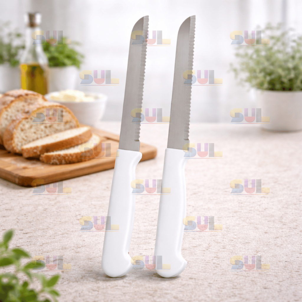======================================= Bem-vindo ao "GRUPO SUL". Trabalhamos com produtos de alta qualidade garantindo assim um preço excelente para o consumidor final. Geramos NF-e de todas as VENDAS realizadas para melhor segurança do CLIENTE. Realizamos ENVIO IMEDIATO após a confirmação do pagamento. ======================================= Conjunto de 02 Facas de Cozinha Serrada - Detalhes que Fazem a Diferença! Apresentamos o Conjunto de 02 Facas de Cozinha Serrada com cabo de plástico branco com aproximadamente 32cm, ambas em material de aço inox - o conjunto perfeito para garantir precisão e durabilidade nas suas preparações culinárias. Veja por que este conjunto é a escolha certa para chefs e amantes da cozinha: Descrição das Facas de Cozinha Serrada: Material de Alta Qualidade: Fabricadas em aço inoxidável de alta qualidade, essas facas são resistentes à corrosão, não enferrujam e mantêm sua nitidez. Design Serrado: A lâmina serrada é ideal para cortar alimentos de textura mais dura, como pães, carnes e vegetais crocantes. Cabo Ergonômico: Os cabos brancos de plástico oferecem uma empunhadura confortável, tornando o manuseio seguro e preciso. Qualidades das Facas de Cozinha Serrada: Durabilidade e Resistência: Construídas com materiais de alta qualidade, essas facas são projetadas para durar muitos anos. Design Funcional: As lâminas serradas proporcionam cortes precisos, e os cabos ergonômicos garantem conforto durante o uso. Versatilidade: Ideais para uma variedade de tarefas na cozinha, desde cortar pães até fatiar carnes e legumes. Conteúdo do Conjunto: 02 Faca de Cozinha Serrada (aprox. 32cm) =======================================