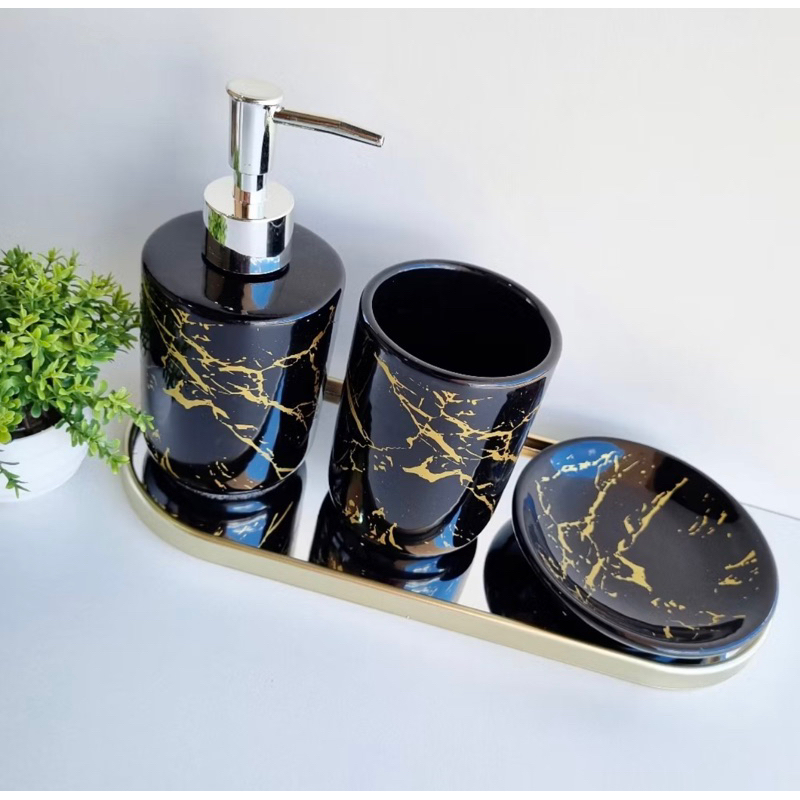 KIT BANHEIRO - 3 PEÇAS O Kit banheiro 3 peças faz toda diferença na decoração do seu banheiro dando aquele toque especial. Em duas cores: PRETO e BRANCO. PUMP: cor PRATA. Especificações Técnicas: - Marca: Clink - Material: Cerâmica Conteúdo:-1 Porta sabonete líquido.-1 Saboneteira.-1 Porta escova de dentes