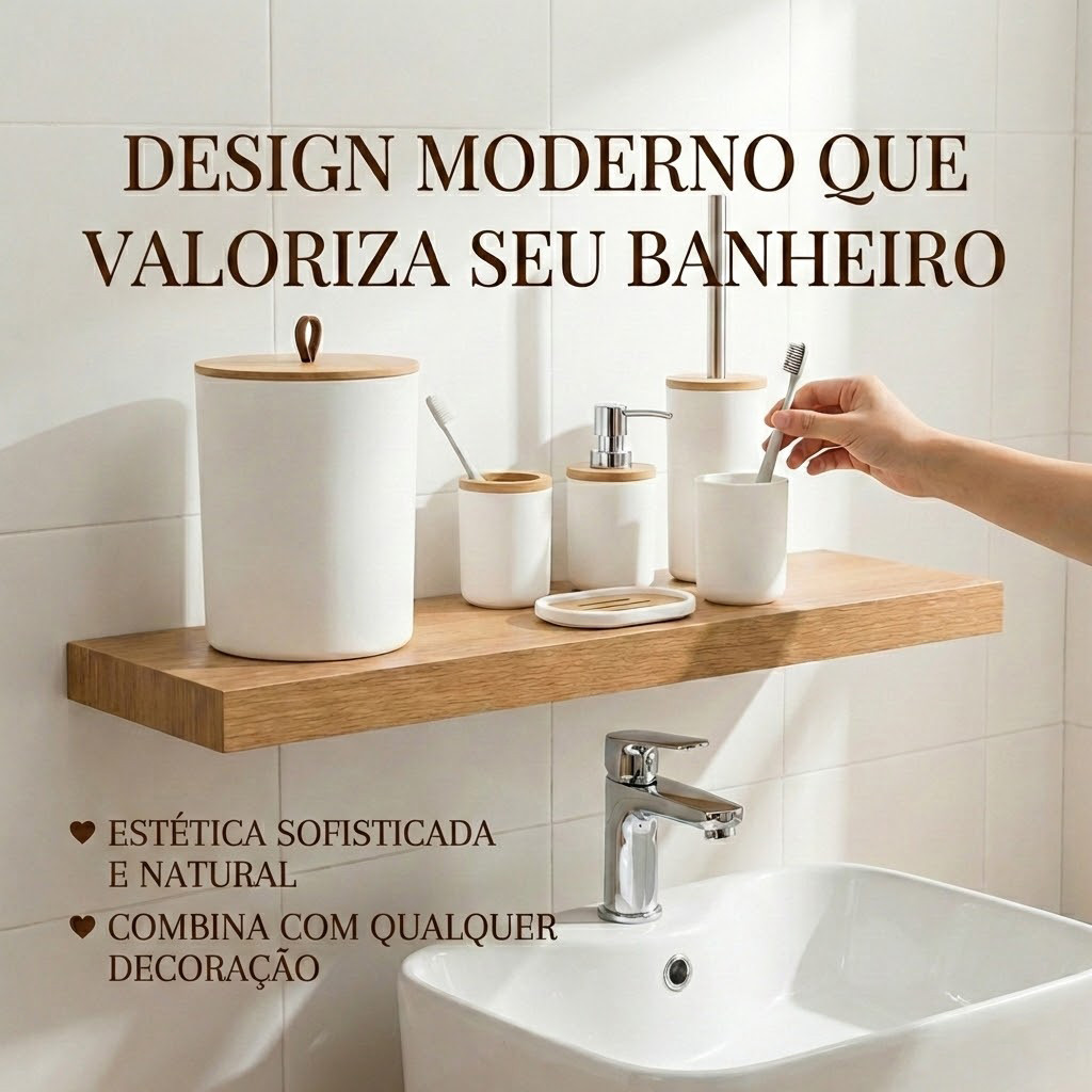 Kit Conjunto Banheiro 6 Peças Lixeira Com Tampa Bambu Plástico Organizador Decoração Lavabo Tippi