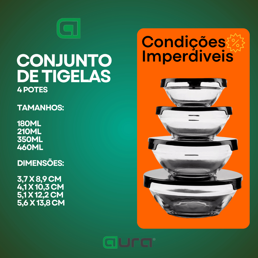 Conjunto de Tigelas Bowls de Vidro com Tampa - Praticidade e Qualidade para sua Cozinha Renove sua cozinha com o Conjunto de Tigelas Bowls de Vidro com tampa na elegante. Este conjunto é composto por uma variedade de tamanhos, atendendo às suas diferentes necessidades de armazenamento e preparação de alimentos. Composição do kit Conjunto de potes : 1 tigela de 500 ml 1 tigela de 350 ml 1 tigela de 250 ml 1 tigela de 100 ml Características do Produto: kits compostos por 1 Kit = 4 potes. Livre de BPA: As tampas das tigelas são fabricadas em plástico livre de BPA, garantindo segurança e qualidade para armazenar seus alimentos. Versatilidade: Este conjunto é adequado para uso no micro-ondas e no freezer, oferecendo praticidade na hora de aquecer ou congelar seus alimentos. Vidro de Alta Qualidade: As tigelas são feitas de vidro resistente, que ajuda a manter a higiene e o sabor dos alimentos, além de ser fácil de limpar e muito prático para o dia a dia. Praticidade: Com tamanhos variados, este conjunto é ideal para armazenar, preparar e servir uma variedade de alimentos, tornando-se um acessório indispensável na sua cozinha. Eleve sua experiência na cozinha com o Conjunto de Tigelas Bowls de Vidro com Tampa. Garanta já o seu e desfrute de qualidade, praticidade e versatilidade no preparo das suas refeições diárias! AS CORES SÃO ENVIADAS SORTIDAS.