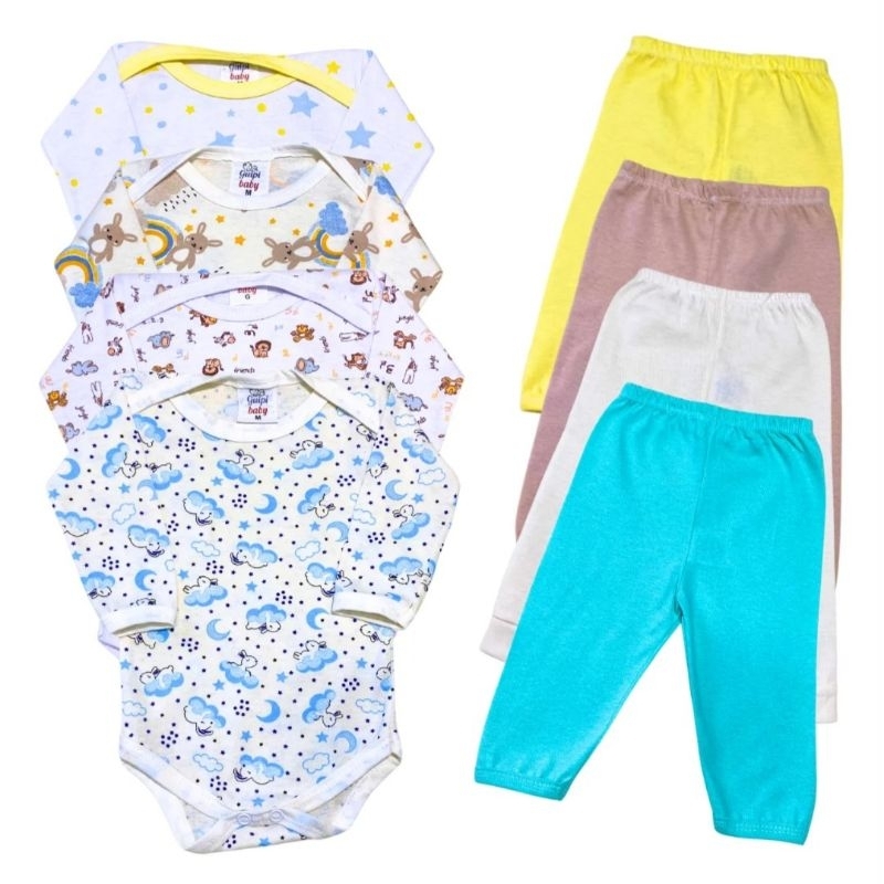 Kit Conjunto Enxoval Bebê 8 Peças Body estampado manga longa e Mijão 100% algodão.
