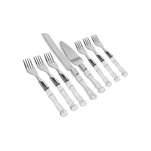 Torne seu momento da sobremesa ainda mais gostoso com este kit para bolos. Sirva com charme e elegancia. Produzido em aço inoxidável e com cabo em poliestireno transparente traz um requinte de luxo e praticidade. -Kit 8 Peças 1 Espátula: 25 x 6 cm 1 Faca: 25 x 2,5 cm 6 Garfos: 16 x 2,5 cm Material: Aço inox e plástico Cabos: Cristal