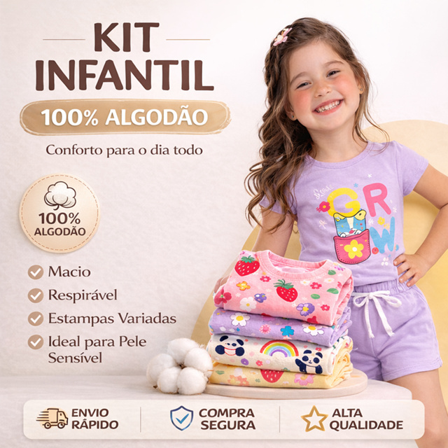 🌸 Cannia Kids – Conjunto Infantil Feminino Premium Qualidade, conforto e estilo reunidos em uma coleção pensada para acompanhar a rotina das pequenas com liberdade e durabilidade. Cada conjunto é desenvolvido com malha 100% algodão, proporcionando toque macio, excelente respirabilidade e conforto ideal para o dia inteiro. 🧵 Diferenciais da Linha Premium • Camisetas em malha 100% algodão • Tecido leve e confortável para uso prolongado • Gola com acabamento reforçado • Shorts com elástico macio que não aperta • Modelagem que permite liberdade de movimento Peças ideais para escola, passeios e momentos de lazer. 🎁 Opções de Kits ✔ Kit 4 peças 2 camisetas + 2 shorts ✔ Kit 6 peças 3 camisetas + 3 shorts ✔ Kit 8 peças 4 camisetas + 4 shorts 🎨 Seleção da Coleção As estampas são selecionadas conforme disponibilidade da coleção, mantendo o padrão visual e a qualidade da Cannia Kids. • Não realizamos escolha de modelos específicos • Os kits são montados com variações de cores e estampas 🚚 Envio Ágil Pedidos confirmados até às 11h são enviados no mesmo dia útil.