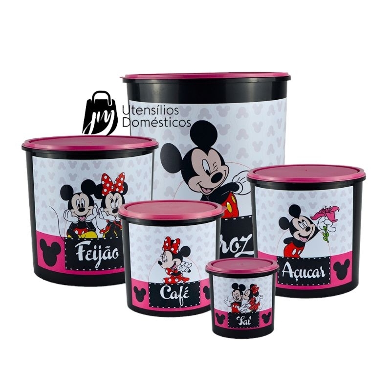 kit 5 peças mantimento REDONDO plástico com tampas rosa e vermelha ,( decorado Minie e mickey) Os potes são enviados um dentro do outro . Contem: 5 frascos redondos para mantimentos. Capacidade "aproximadas" de armazenamento Número 5 Arroz - 7,2 litros Número 4 Feijão - 4 litros Número 3 Açúcar - 2,3 litros Número 2 café - 1,4 litros Número 1 sal- 800 ML não usar palha de aço na limpeza para maior durabilidade. Dúvidas estamos a disposição no chat.