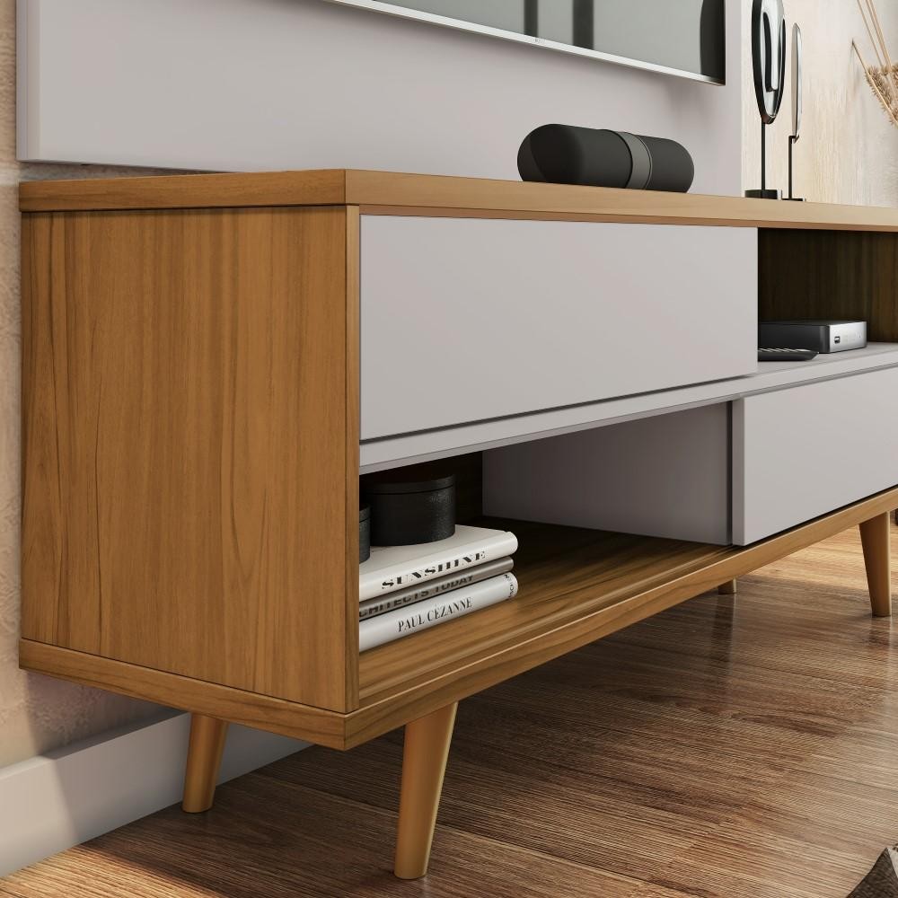 Kit Conjunto Rack Painel Para TV Até 50" 2 Portas 2 Prateleiras Sala Estar Marrom Madeira Off White