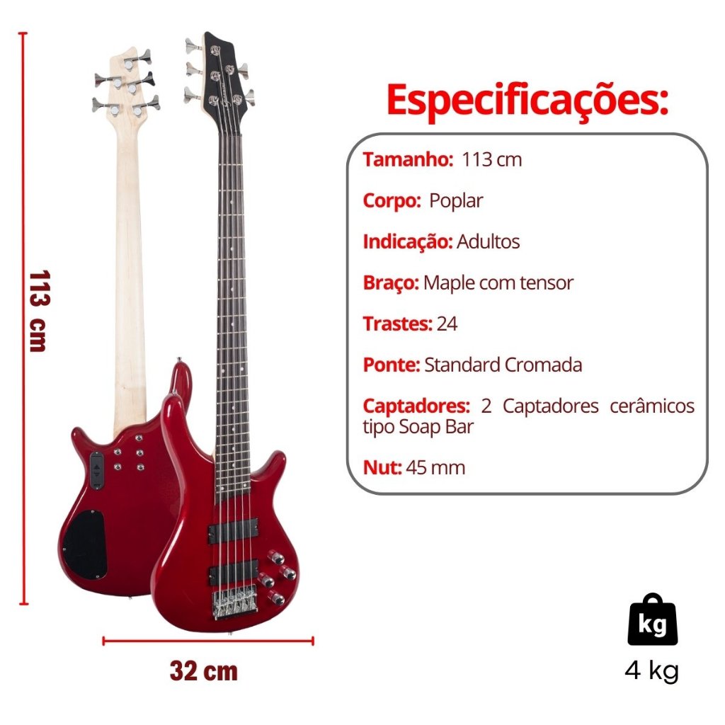 Itens do kit: 1x Contra Baixo Giannini 5 Cordas Ativo Gb205a 1x Capa Contra Baixo Luxo Acolchoada 1x Correia Basso SF112 1x Cabo P10 P10 Emborrachado 5m 1x Afinador Digital Clip 1x Amplificador Para Contra Baixo O Giannini GB205 é ideal para baixistas que estão iniciando, com acabamento muito bem feito com verniz brilhante no corpo, tarraxas cromadas estáveis e seguras na afinação. Mas o destaque deste belo Contra Baixo Giannini é o timbre, ele produz graves bem marcantes e agudos bem definidos. O Giannini GB205 é sem dúvida uma das melhores opções do mercado para baixistas iniciantes, você vai se apaixonar pelo instrumento. Especificações: Modelo: Contra Baixo Elétrico Ativo 5 Cordas Corpo: Poplar Braço: Maple com tensor Escala: Rosewood Trastes: 24 em Alpaca Marcação: Bolinhas Brancas Ponte: Standard Cromada Tarraxas: Blindadas Cromadas Captadores: 2 Captadores cerâmicos tipo Soap Bar (ativo) Controles: Volume, Balance, Treble e Bass (circuito ativo 9V) Acabamento: Verniz brilhante Amplificador: Marca: Sheldon Modelo: BSS150 Potência: 15W RMS Entrada: P10 para contrabaixo Saída: P10 para fones Controles: Gain, Bass, Middle, Treble, Volume Alto-falante: 6 polegadas Alimentação: Bivolt manual (125V/250V) Dimensões: 262 mm (comprimento) x 262 mm (altura) x 145 mm (largura) Produto 100% original com garantia em todo território nacional.